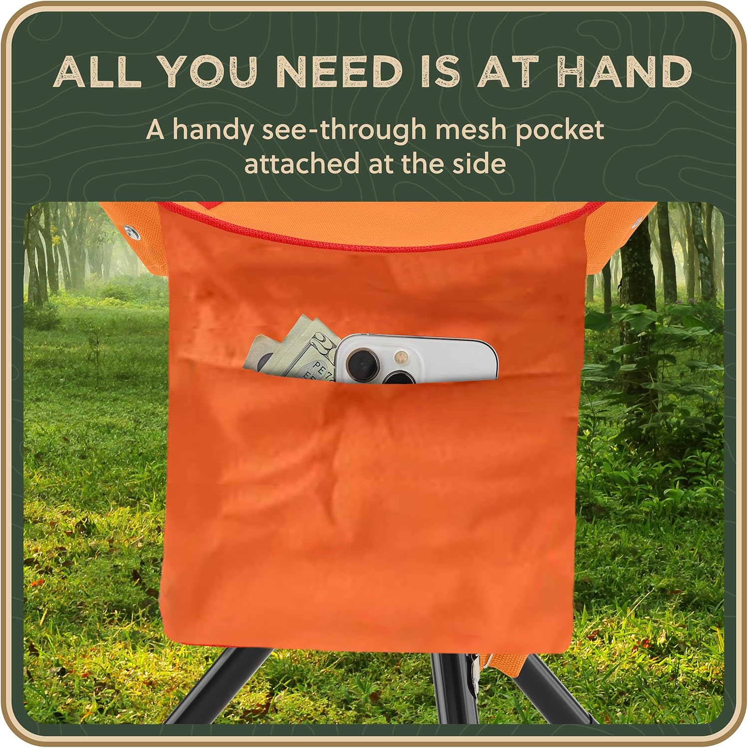 - â—Ź HANDY MESH STORAGE: Featuring a breathable mesh pocket, the small hunting chair allows for easy access to your essentials like snacks, gadgets, or small tools, keeping them secure by the folding hunting chair without the bulk of larger pockets