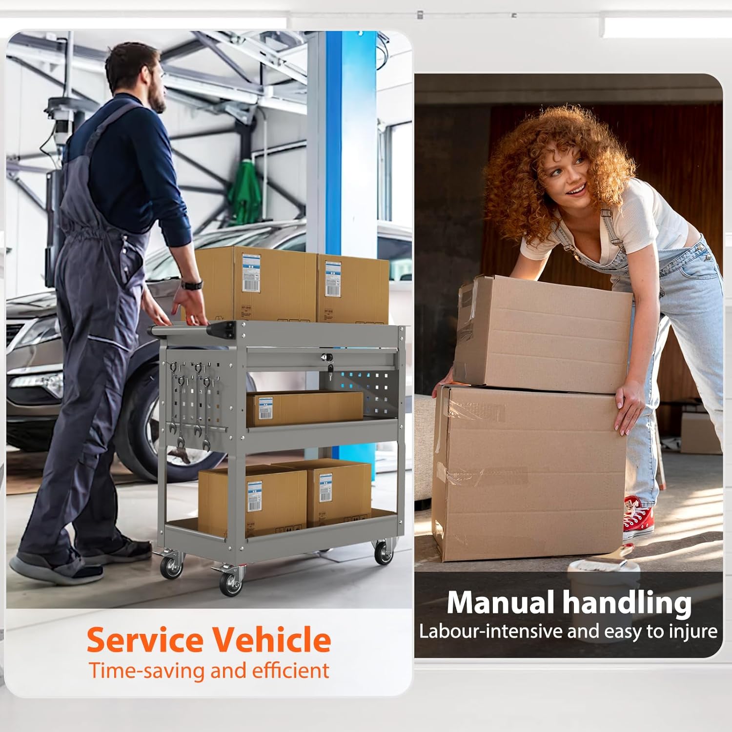 - đ¨ăEasy to Moveă: The tool cart on wheels is equipped with 2 universal wheels, 2 fixed wheels, plus a handle, so you can move the tool cart easily. Two universal wheels with a braking function and sidebar can help you easily move the tool cart to where you want to go and place it steadily.