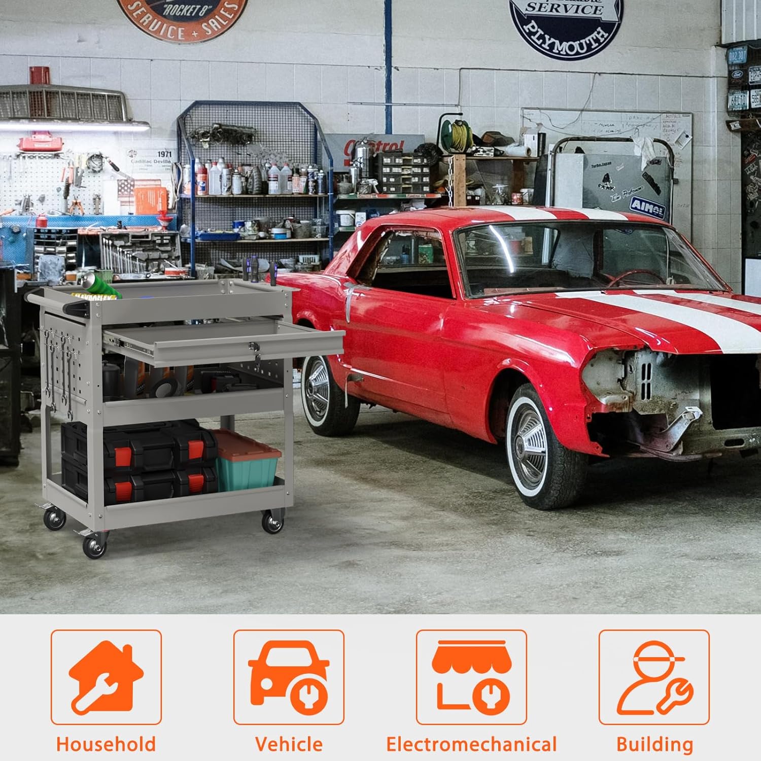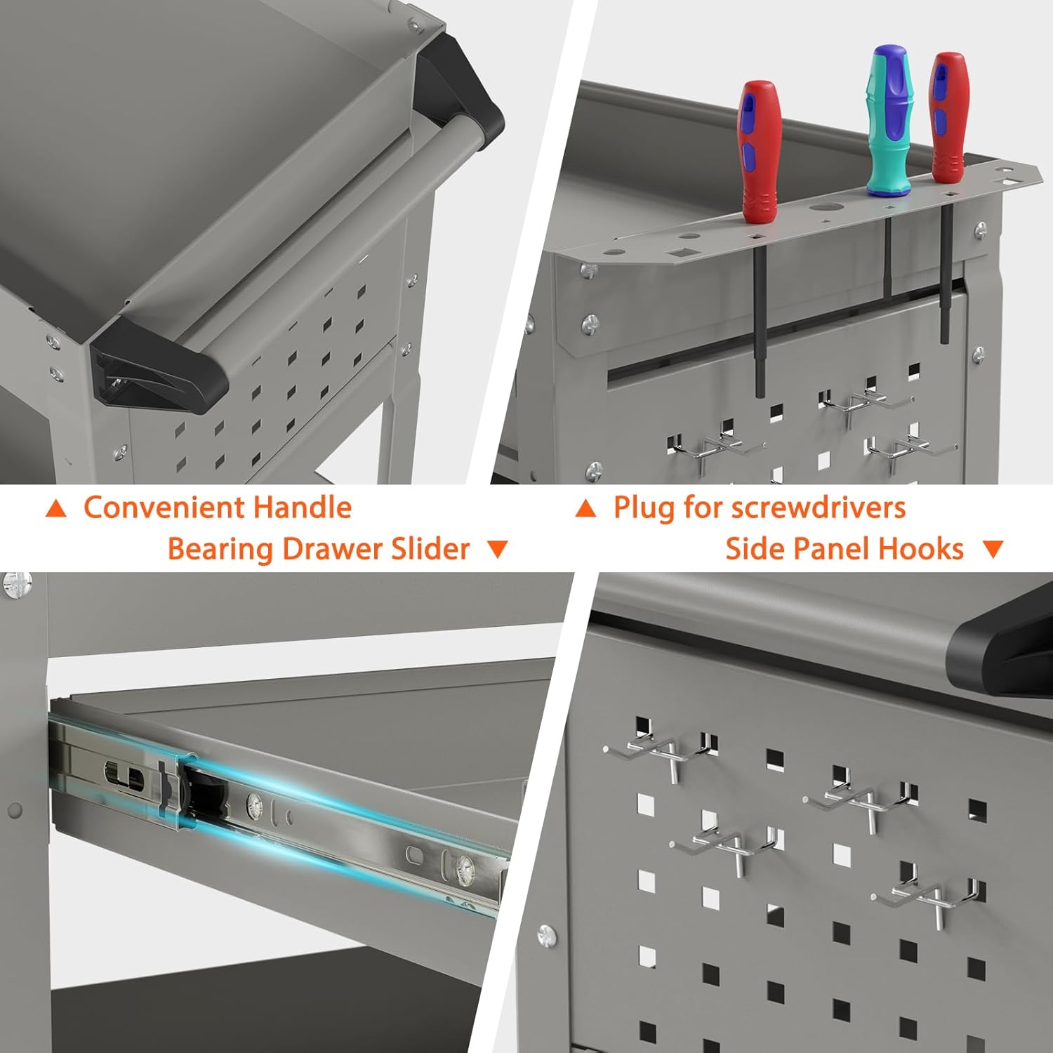 - đ¨ăMultiple Storage Optionsă: This tool cart has 3 trays, a lockable drawer, tool slots of various sizes, and a hanging board with 4 hooks, the tool cart gives your tools finally have their designated spots. No more searching or mess.
