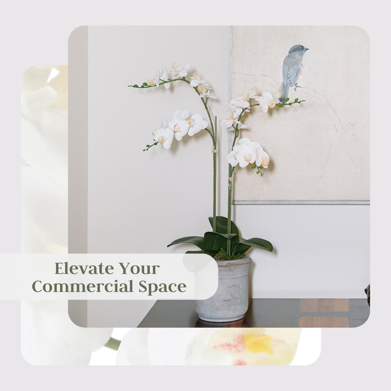 - HIGH-QUALITY MATERIALS: The durable grey colored pot and beautiful lifelike white orchid blooms combined with natural-looking leaves and curly willow accents with wire stems will shape your plant as desired for years to come.