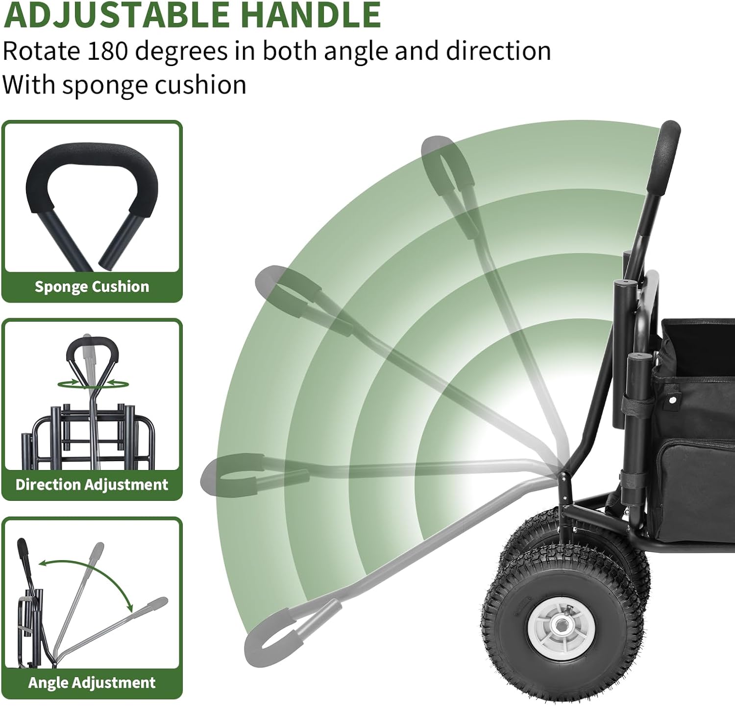 - Adjustable Handle: The folding wagon handle with sponge cushion can enhanced comfort during use. The handle also can rotate 180 degrees in both angle and direction.It can flexibly control the direction and adjust the angle freely