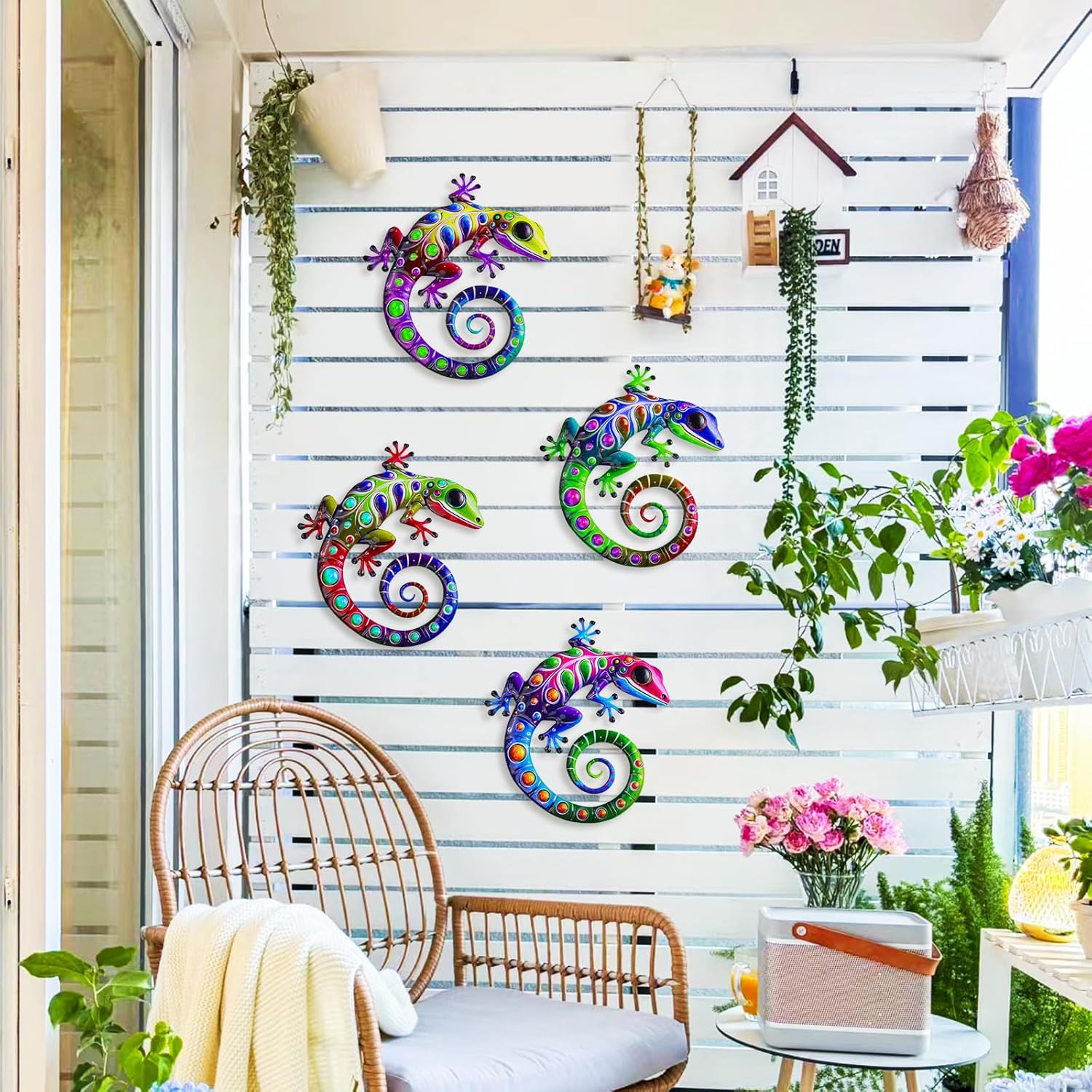 ULENDIS 4 Pack Metal Gecko Wall Decor, 7.8 Inch Lizard Outdoor Wall Art Fence Decorations for Patio and Yard, Colorful Hanging Decoration for Garden Living Room Bedroom Patio Balcony