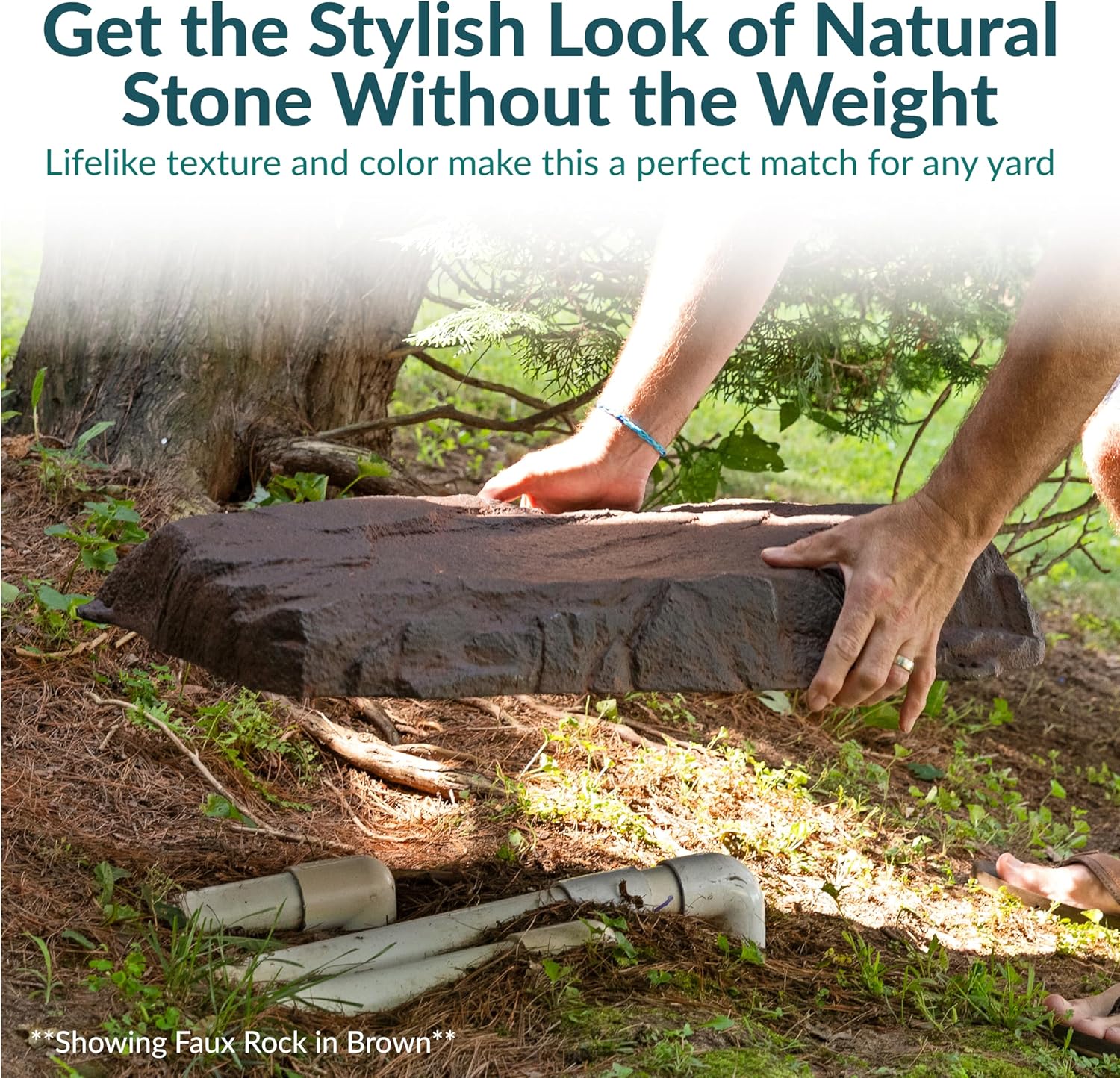 - DESIGNED TO CAMOUFLAGE: The short decorative rock cover features a durable polyresin construction with a neutral color and texture. The material withstands the elements, while the lifelike design and irregular edges blends naturally into any outdoor space. This artificial rock is for decorative purposes only; do not stand or climb on it.