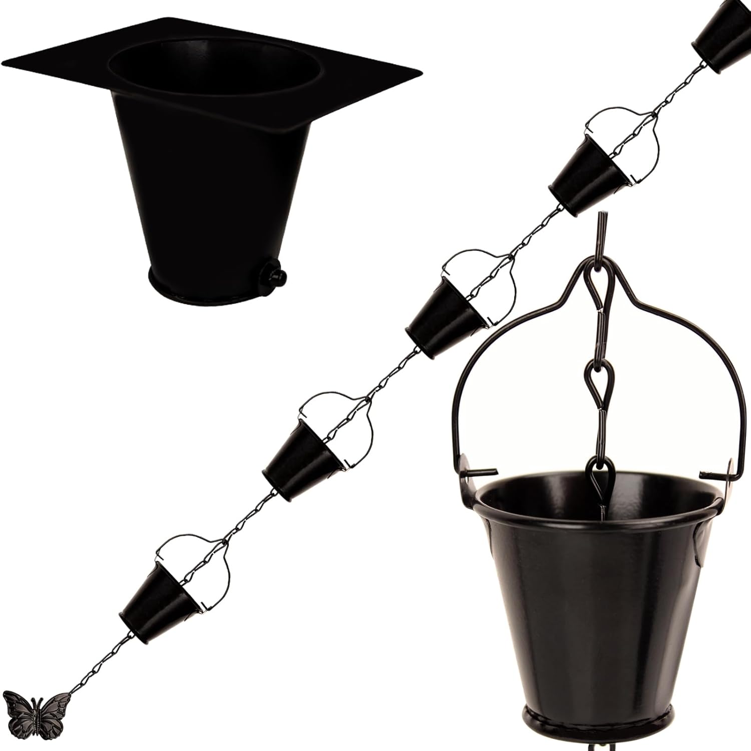 Rain Chain for Outside with 1 Adapter, Wrought Iron Rain Chains 9 FT Set,Rain Chains for Gutter with Rain Chain 16 Cup and Decorative Butterfly (Black)