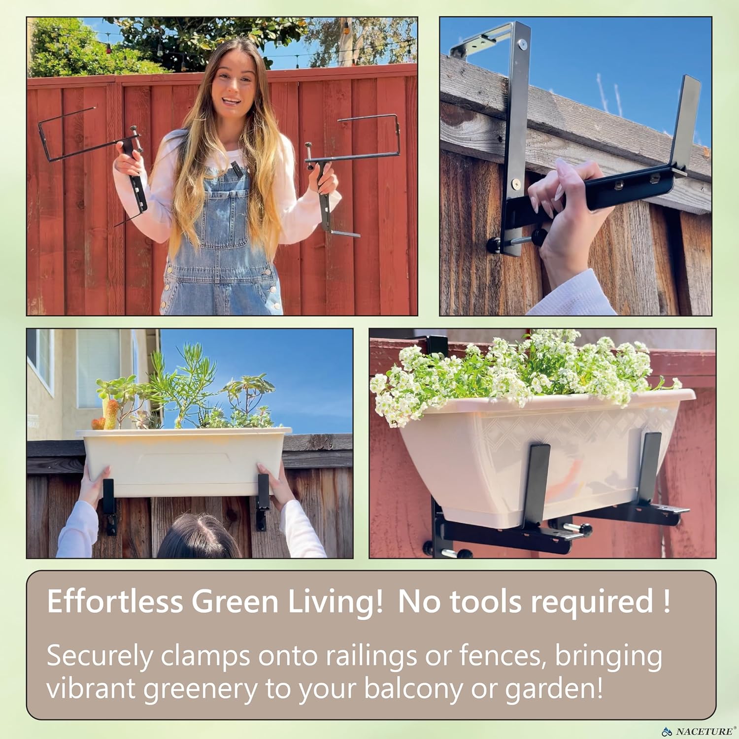 - ⚙️ ADJUSTABLE DESIGN - The innovative design allows the top width to be adjusted to fit railings between 1.2 to 7.7 inches, while the base width adjusts from 5.9 to 10.2 inches. This versatile feature makes these window planter brackets suitable for a wide range of pot sizes and railing types, ensuring a snug fit every time!