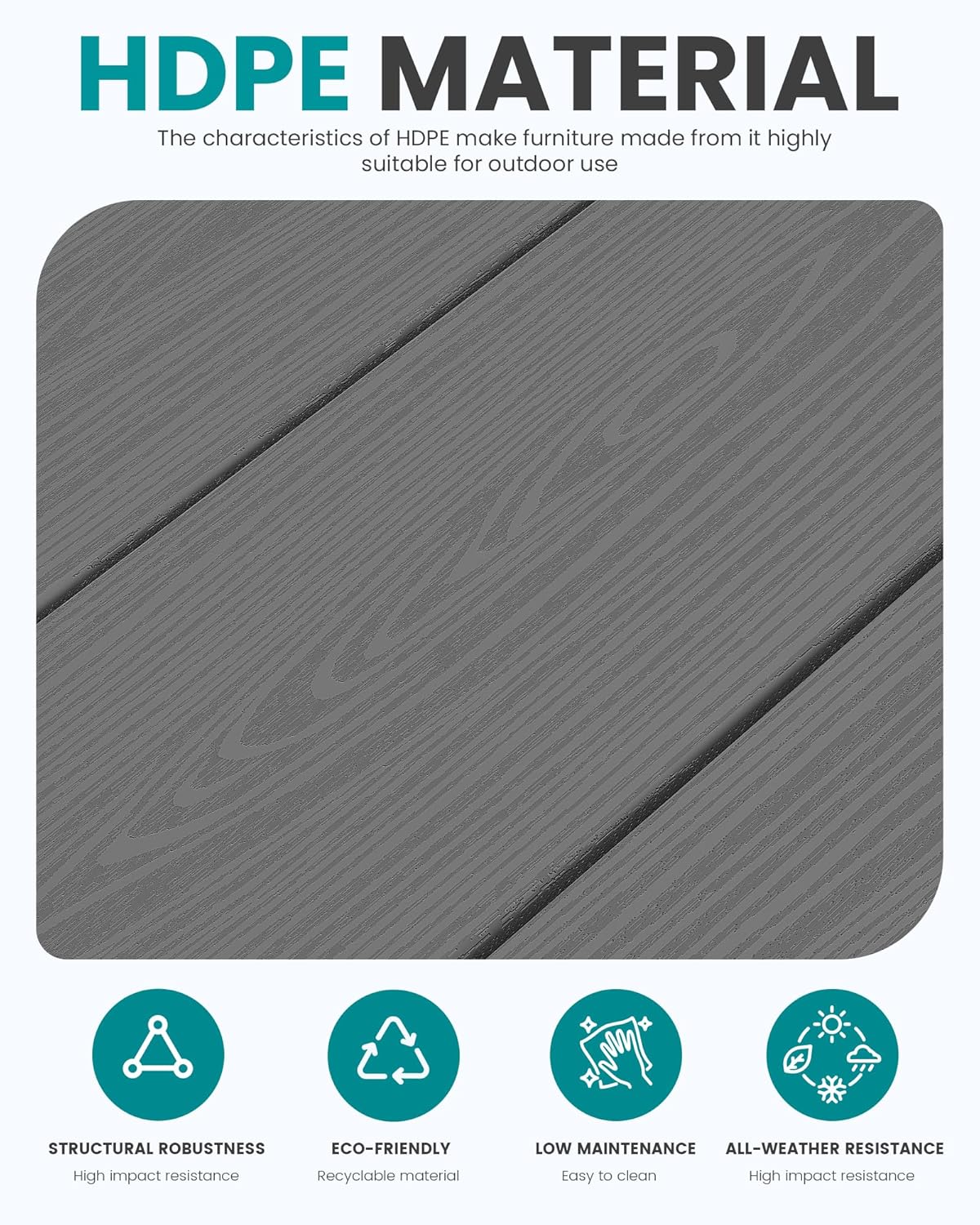 - Advantages of HDPE Material: Made from high-density polyethylene (HDPE), this HDPE outdoor furniture set not only withstands various harsh weather conditions such as intense sunlight, rain, and cold climates but also features UV resistance. This ensures that the outdoor sofa and coffee table will remain distortion-free and color-fast even after years of use.
