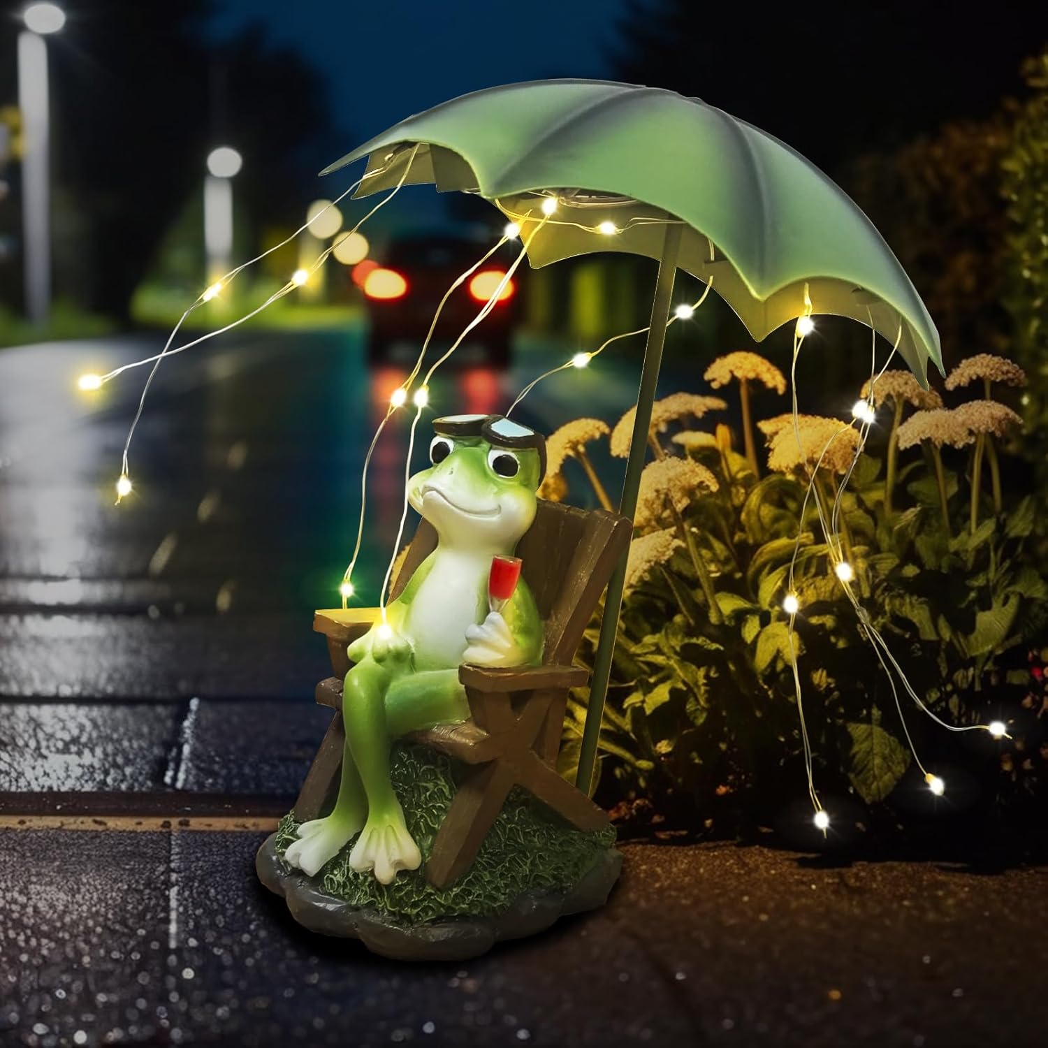 - Yard Decor: The garden animal statue hides under the umbrella and sips delicious red wine in your yard, when the night falls, the light beads on the umbrella light up, the romantic atmosphere comes and matches your garden perfectly.