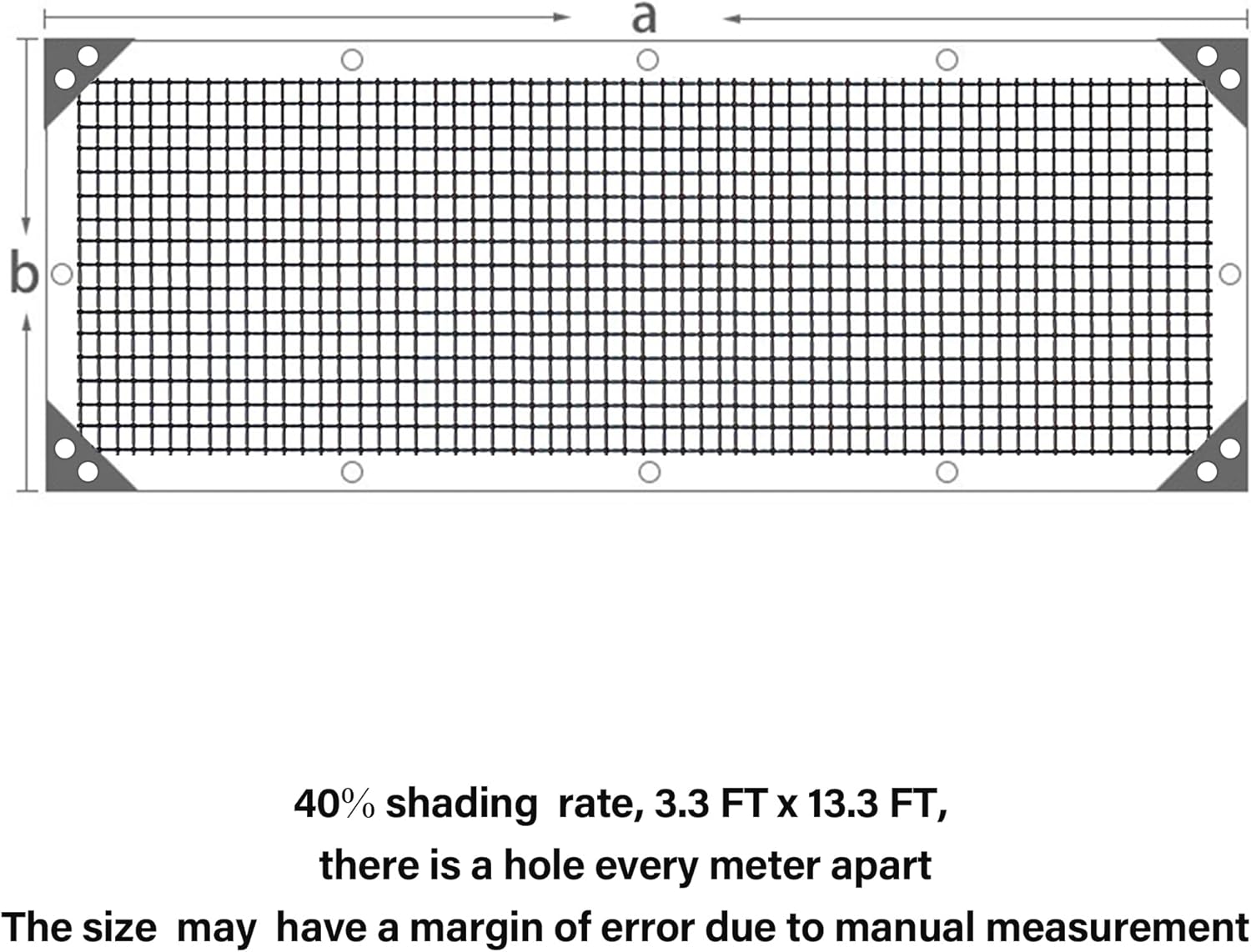 - High Shade Rate: The garden mesh tarp measures 3.3 x 13.3 FT. Our Shade Cloth can resist rays and most sunlight while air can still flow through so as to create a comfortable cool and shaded place for people or plant. It blocks 40% of the sunshine and bring 40% the shadow, so 60% of the sunshine can through it.