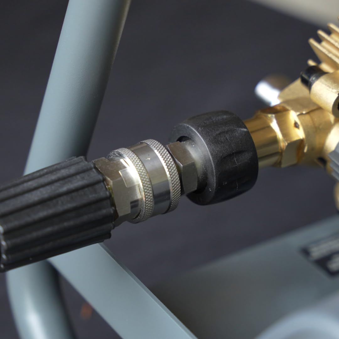 - 【 Heavy-Duty 304 Stainless Steel Construction】 Crafted from fully machined 304 stainless steel, this pressure washer quick connect kit delivers outstanding durability and corrosion resistance. Built to handle the harsh conditions of high-pressure washing, it ensures reliable, long-lasting performance for both residential and commercial use. Perfect as a part of your pressure washer accessories, it includes M22 14mm quick connect hose fittings for secure connections.