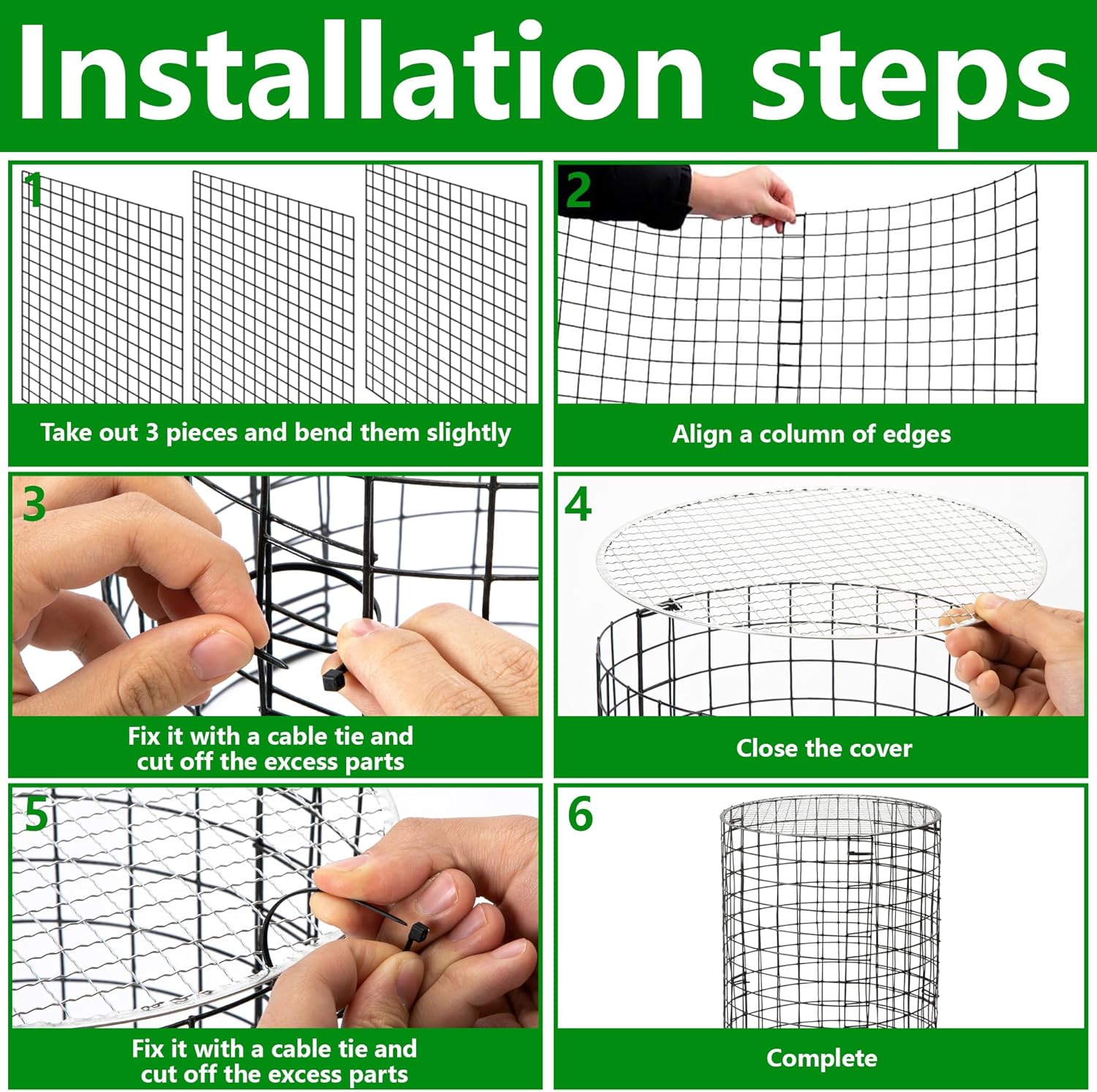 - Easy To Assemble:You don't need extra tools, just enclose 3 pieces of metal mesh and secure them together with nylon hand straps. Then place the assembled wire plant cage around the plants, add a lid and you're done. Secure them in the soil with U-shaped ground plugs to make sure they are secure enough.