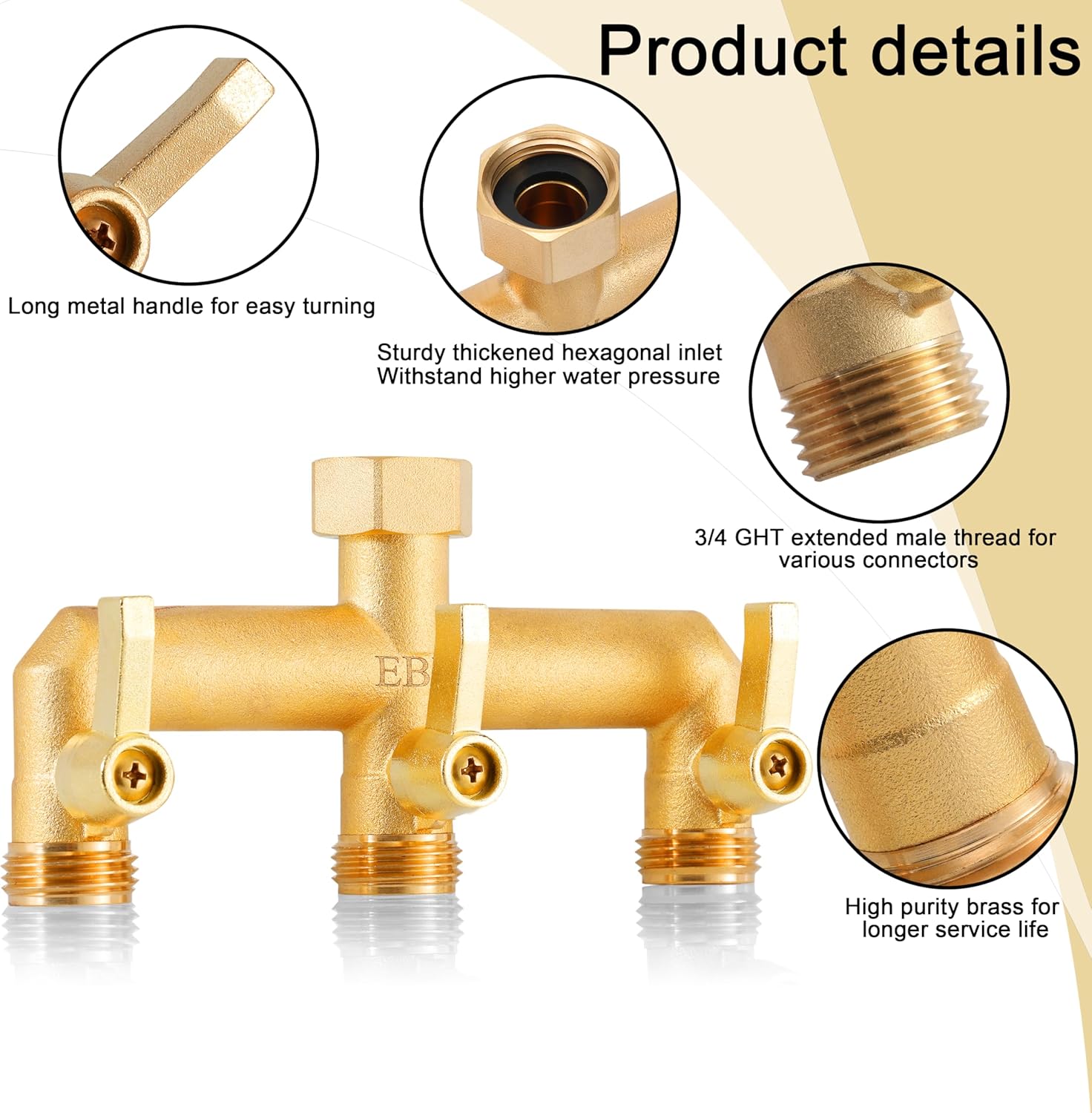 EBH Brass GardenHose Splitter, 3 Way Outdoor Faucet Splitter, 3 Long Metal Handle and Individual On/Off Valve, GHT 3/4-Inch Heavy Duty Hex Female Inlet and 3/4-Inch Male Outlet