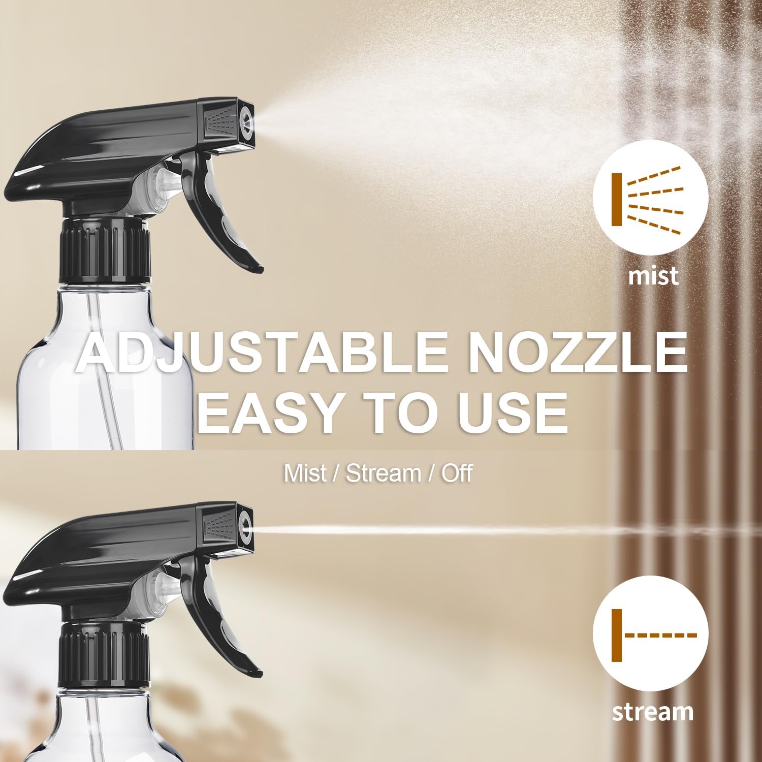- 3 Modes (Fine Mist, Solid Stream & Turn Off) - Easy to hold and spray, these sprayer bottles feature a smooth nozzle adjustment for mist to stream. They deliver a gentle mist that won't harm delicate plants and a solid stream up to 10 feet, catering to different scenarios.