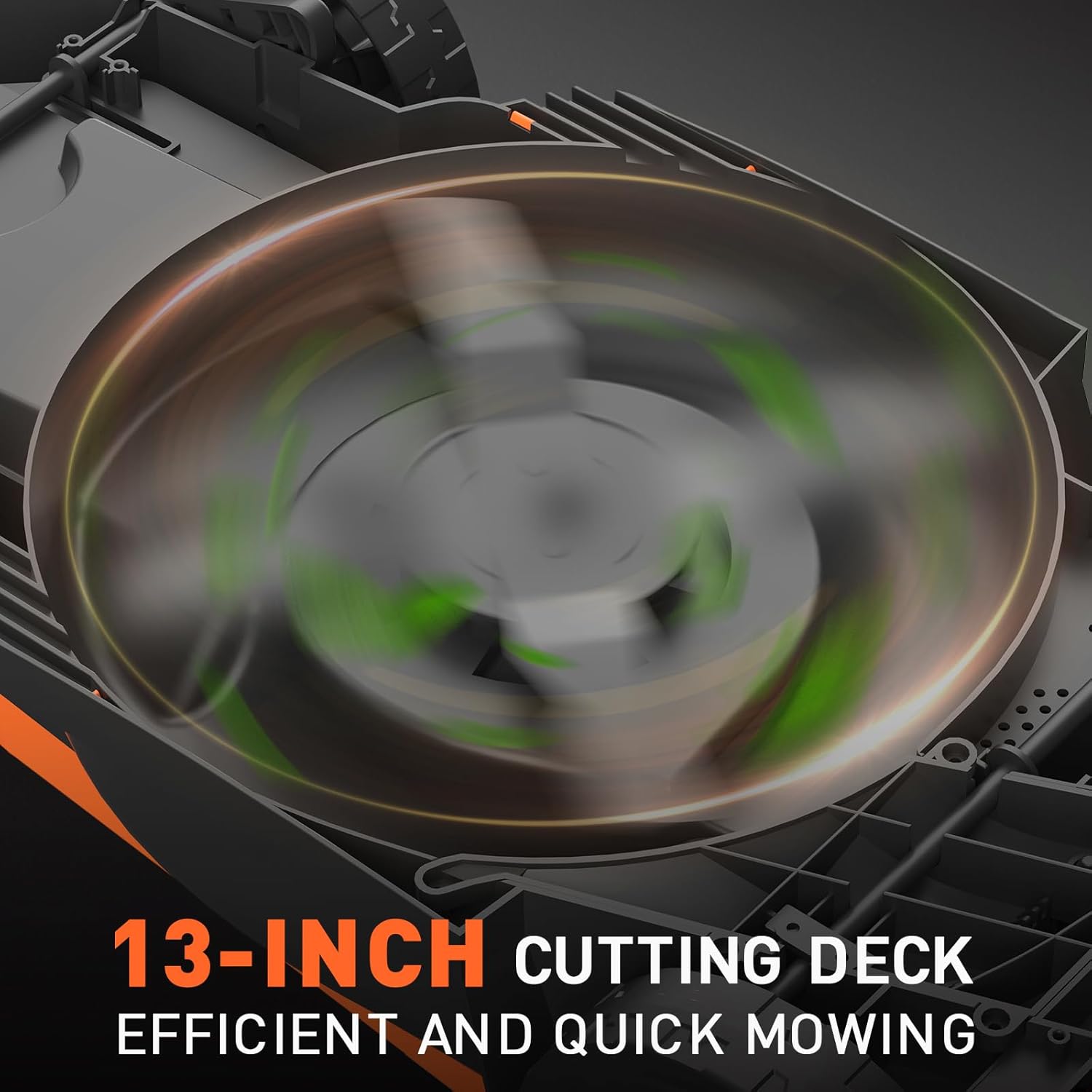 - Brushless Motor-This electric lawn mower features brushless motor with low noise and low vibration. It not only provides powerful power, but also avoids wear on the motor from carbon brushes, thus making the battery mower last longer and lower maintenance cost.