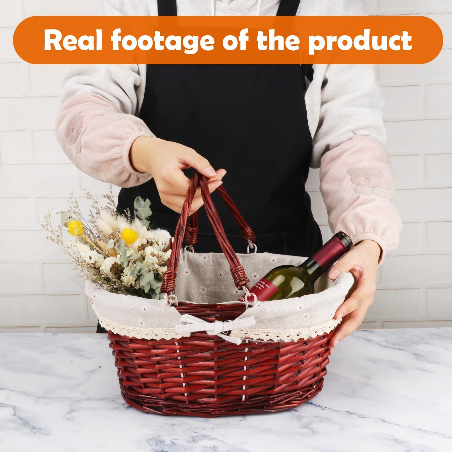 Brown Wicker Basket with Linen Lining, 14 Inch Large Wicker Woven Picnic Basket with Handle for Picnic, Camping, Outdoor Party