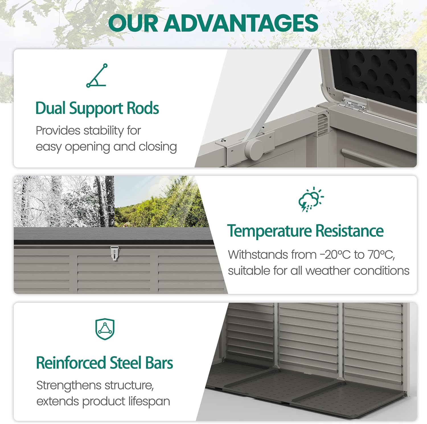 - 130-Gallon Extra-Large Capacity: Measuring 57.6"" x 24"" x 25.4"" (external dimensions), this 130 gallon outdoor storage box provides ample space for patio cushions, gardening tools, patio storage, or pool storage essentials. It accommodates outdoor cushion for 4-7 people, keeping your belongings organized and storage more convenient