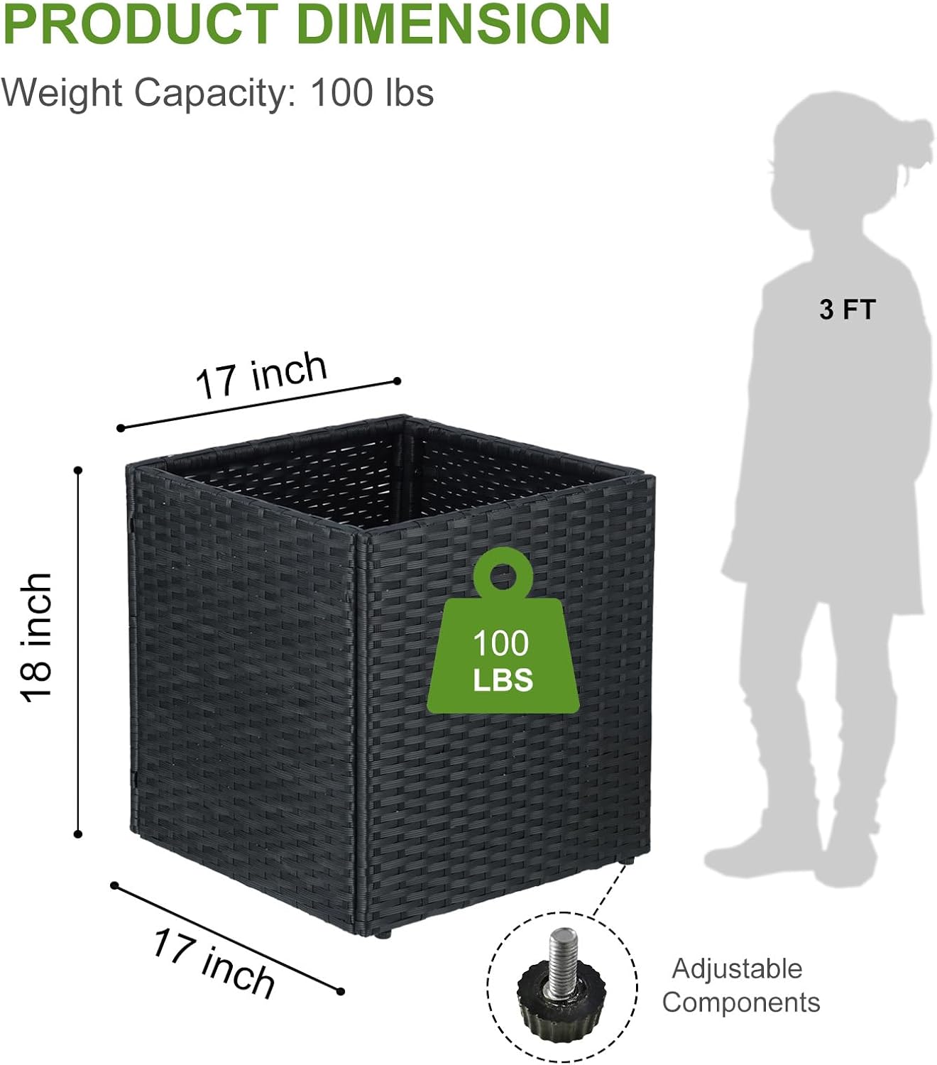 - Dimension: Measuring 17’’ L x 17’’ W x 18’’ H, this modern planter has an ergonomic height that keeps plants up and away from wild animals, making gardening easier by eliminating the need to bend over to water as usual. Available in flat packaging, easy to assemble and with detailed instructions