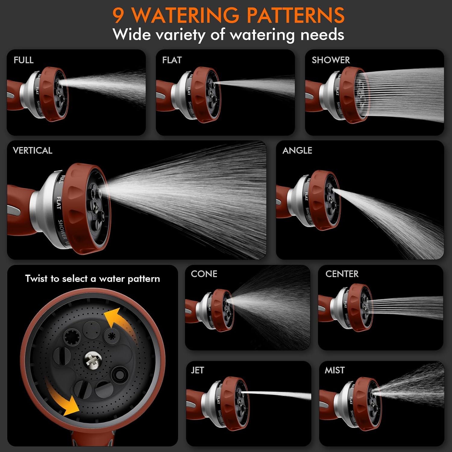 - 【9 Watering Patterns】Rotate the sprayer head dial to select a water pattern from Shower, Flat, Full, Mist, Jet, Center, Cone, Angle and Vertical. Whether you need the high-pressure jet to clean your patio, the useful angle to wash your car, the gentle shower to wash your dog, or the soft mist to water your garden flowers, the 9 patterns have you all covered.