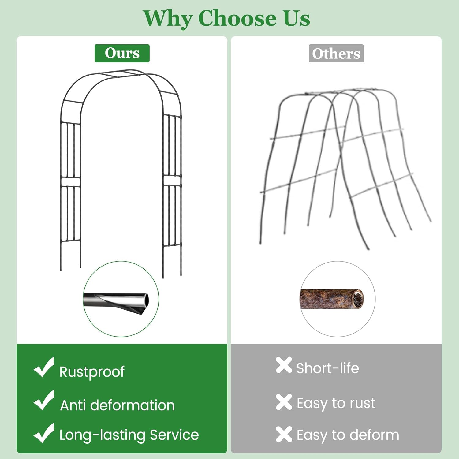 - Wide Application: This garden archway provides ample space for a variety of climbing plants, such as morning glory, Chinese roses, ivies, grapes, tomatoes, and more. Whether you're looking for an indoor decoration or add a touch of greenery to your garden, courtyard or even wedding, this trellis is the perfect choice.