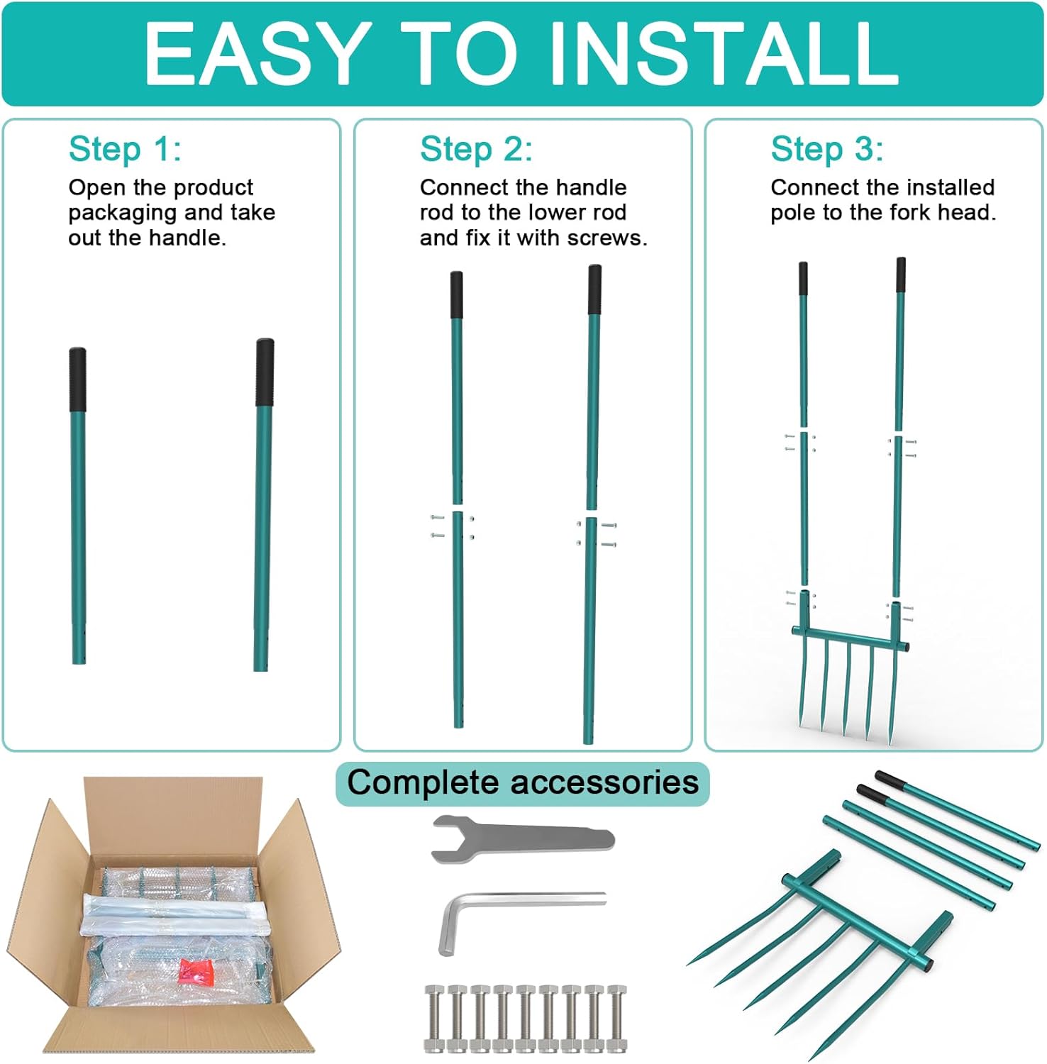 - Attention: Although our potato fork handle is suitable for most harsh soil environments, please avoid using it in extremely hard scenarios such as clearing tree roots or shoveling rocks to prevent deformation and reduce the product's lifespan. Our garden fork heavy duty can be easily installed and disassembled for easy storage. Please note that the 5 tines are sharp; keep the fork out of the reach of children