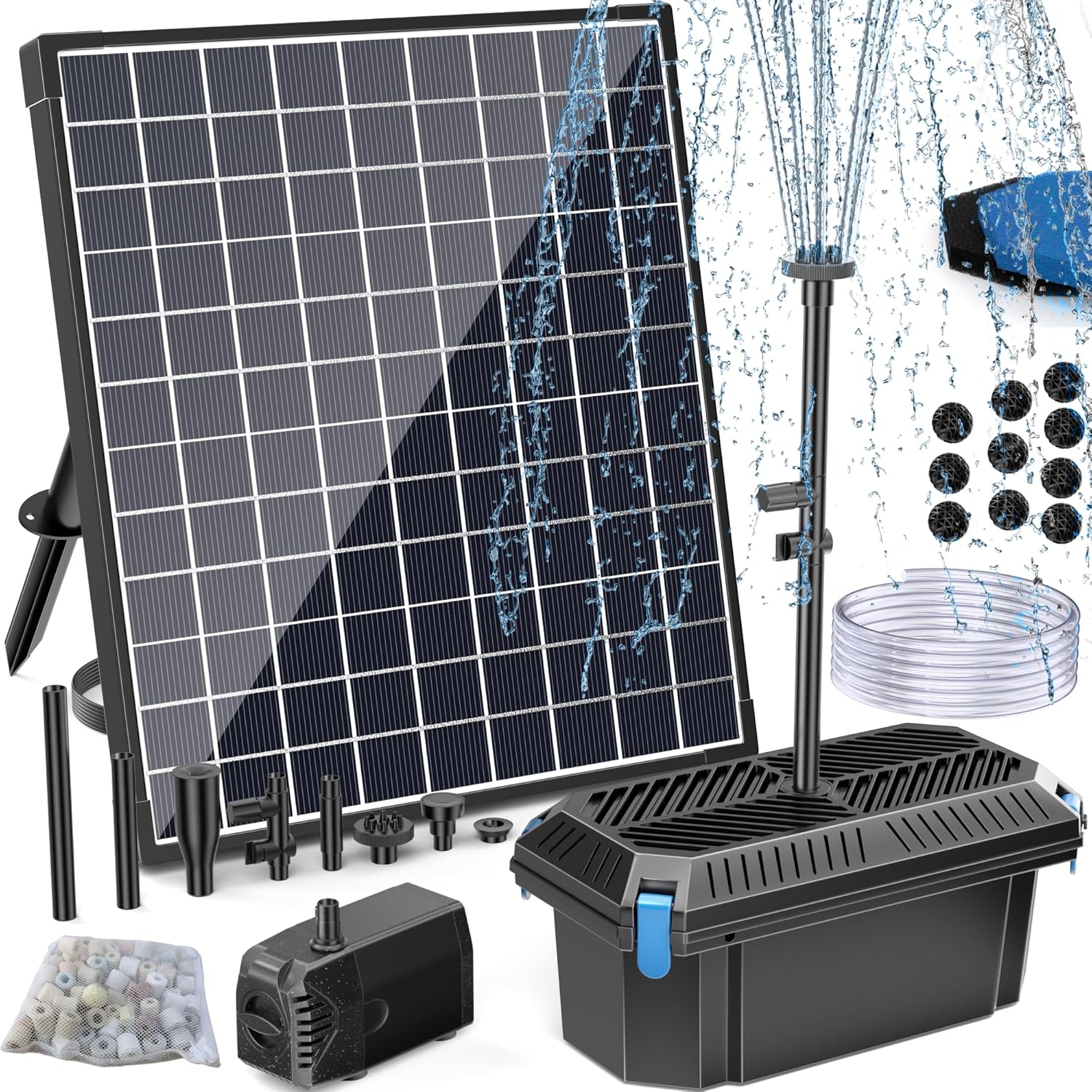 - 【Integrated Filtration System】POPOSOAP solar pond filter box is specially designed to keep the water healthy balance and clarity, can effectively filter debris and suspended particles in water, and protect pumps from debris in small pond. Maintain water sprayed crystal clear. It includes: 1* solar panel, 1* filter box, 1* pump, 4* nozzles & diverter valve, 2* Filter Pads, 10* Bio-Balls, 500g Bio Ceramic Rings and 1* Manual.