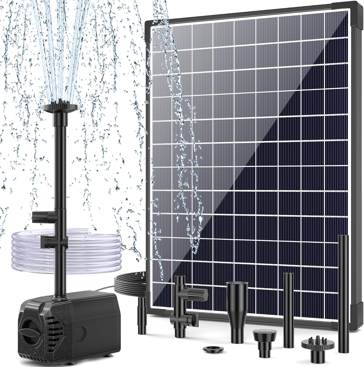 - 【Diverter Valve & DIY】The solar water pump equipped a diverter valve and tubing, you can use the nozzles and tubing at the same time. You can also use separate nozzles or tubing to meet your needs. Besides, the solar fountain comes with a 3/8" slip outlet and 6.56ft clear tubing for you to creat water features.