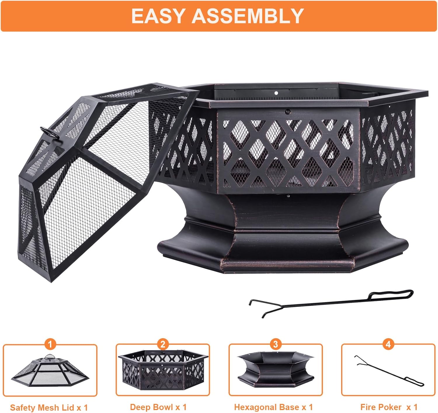 28Inch Outdoor Fire Pit, Hexagon Shaped Wood Burning Firepit for Outside Bonfire, Patio, Backyard and Camping (Antique Bronze)