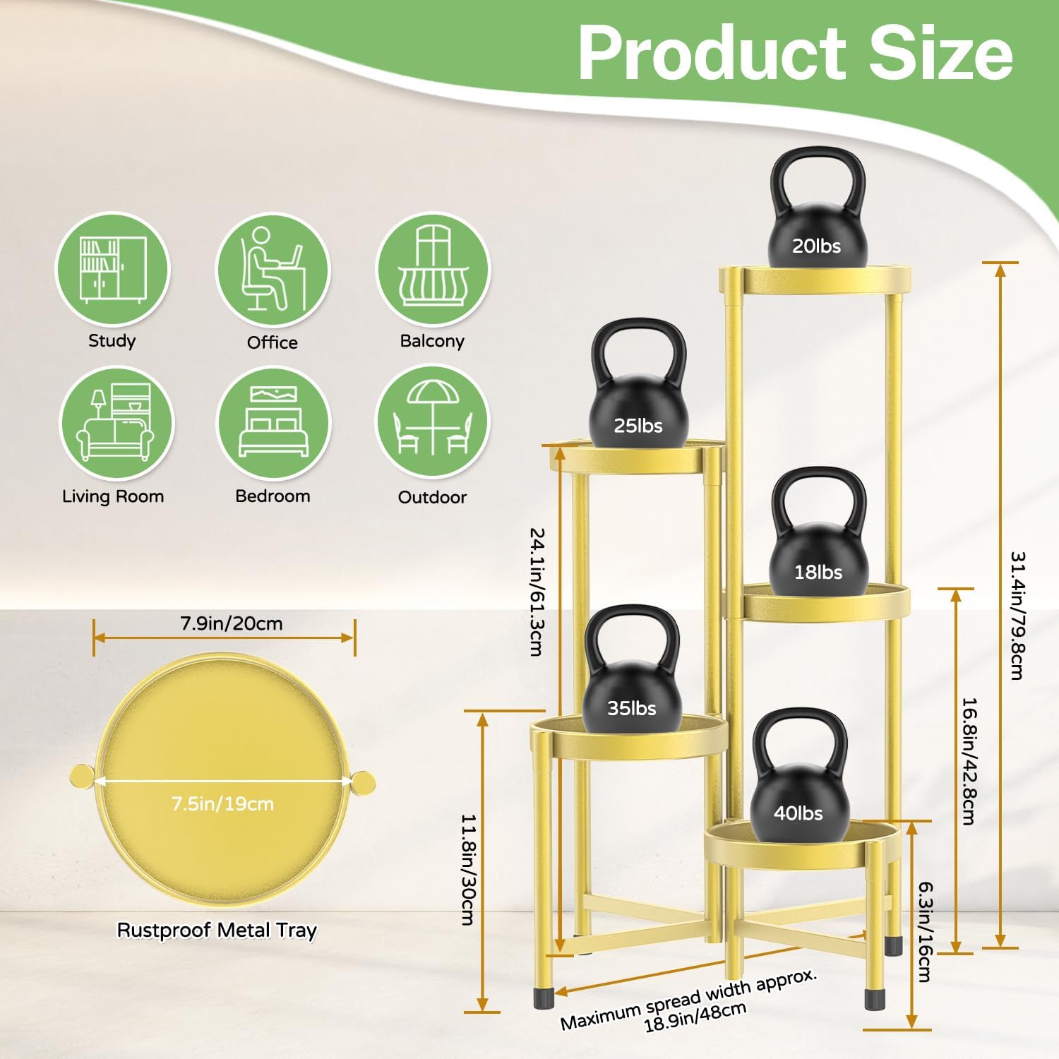 iDavosic.ly Plant Stand Indoor Outdoor, 5 Tier Corner Metal Flower Display Holder Shelf, Folding Tall Orchid Rack for Patio Balcony Porch Garden Living Room House, Gold
