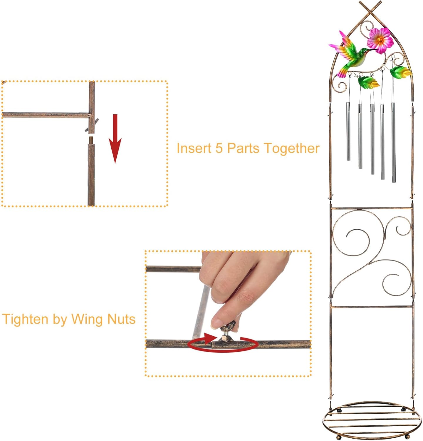 Garden Trellis with Plant Stands, 48” Metal Detachable Hummingbird Plant Pot Trellis with Wind Chimes for Climbing Plants Outdoor Lawn Patio Porches Decor