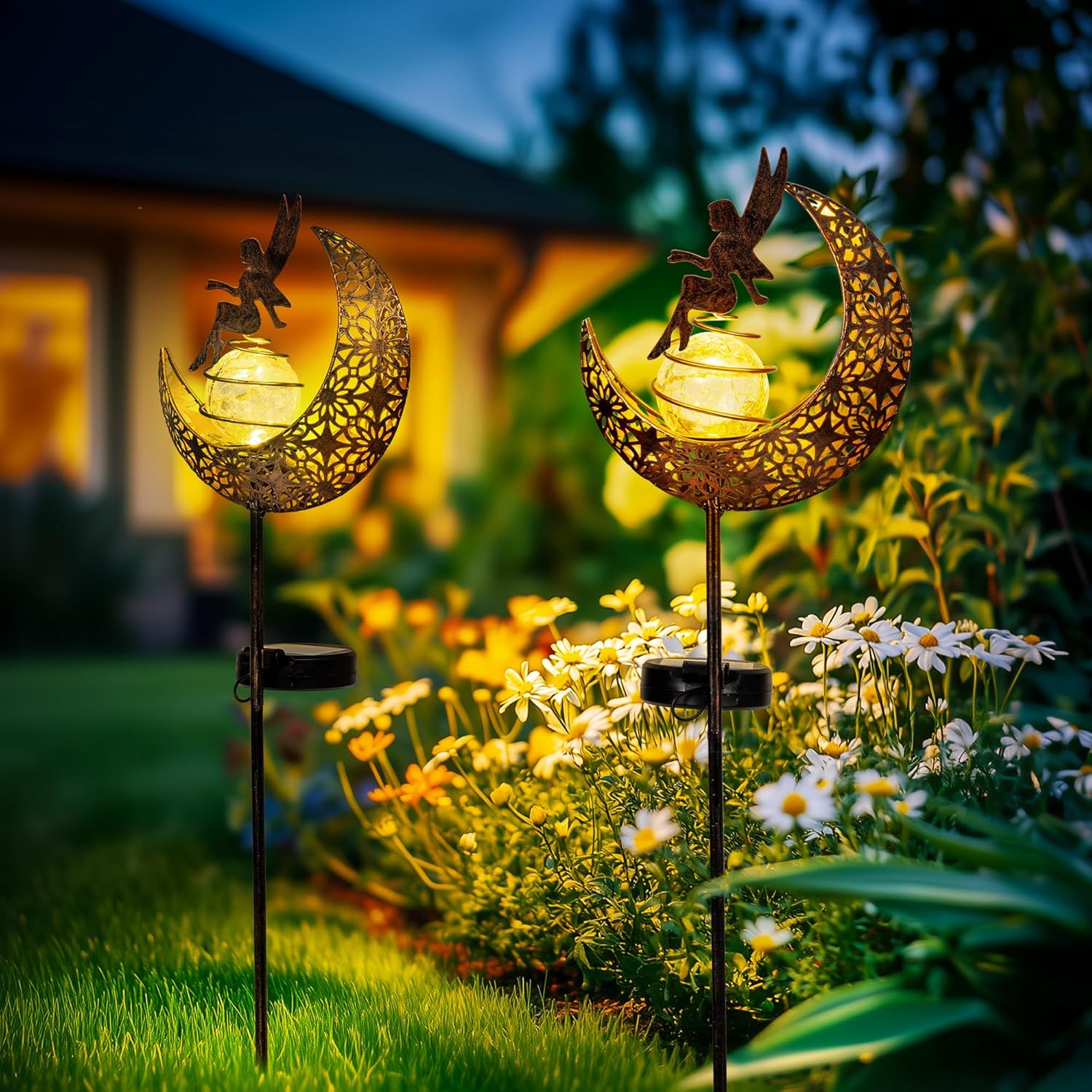 - Enchanting Fairy Garden Moon Design: Add a touch of magic to your garden with our beautifully crafted Fairy Moon Solar Lights. Featuring an elegant metal crescent moon with a delicate fairy silhouette, this enchanting sculpture brings a whimsical and artistic charm to your yard, patio, or porch.