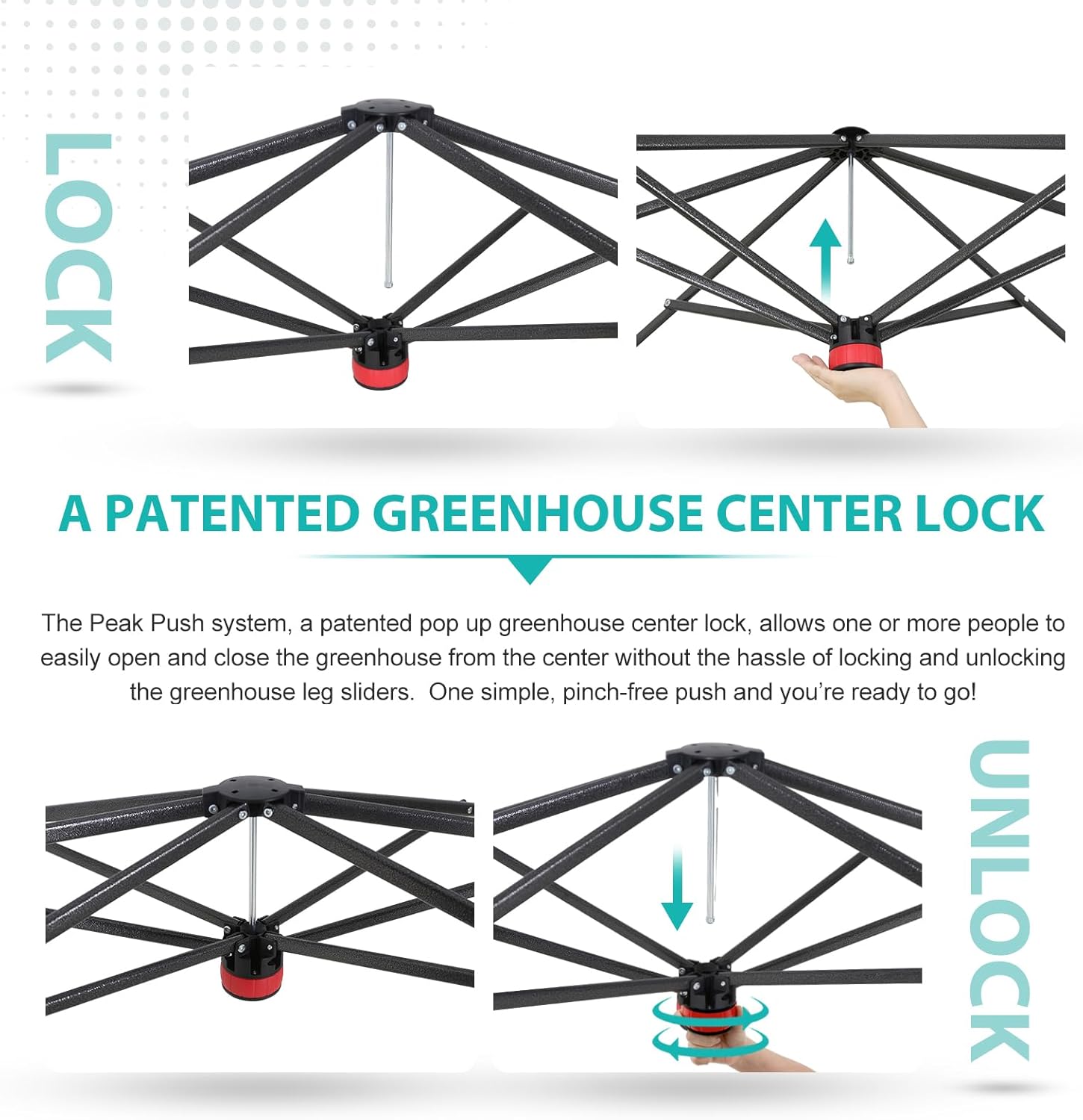 - EASY SETUP: This easy setup pop up greenhouse plant tent features the Peak Push system, a patented greenhouse center lock. The portable greenhouse requires no tools and easily opens and closes from the center in seconds. Its unique greenhouse center lock enables a quick, one person setup, letting you maximize gardening with minimal effort