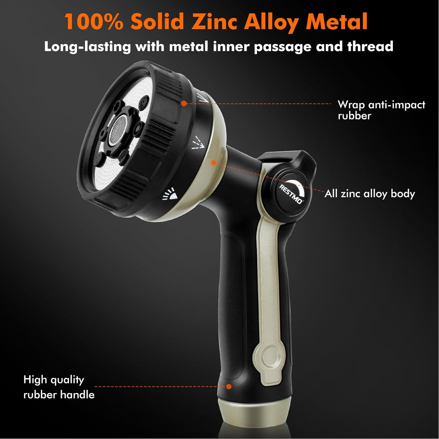 - Heavy Duty Metal Hose Nozzle: Constructed with premium zinc-alloy material, this hose nozzle sprayer is solid & strong to resist daily drops and shocks. The bronze powder painting, TPU coating and rubberized bezel dial can enhance durability & flexibility and withstand hard impacts & heavy force. A long-lasting garden hose nozzle you can count on many years.