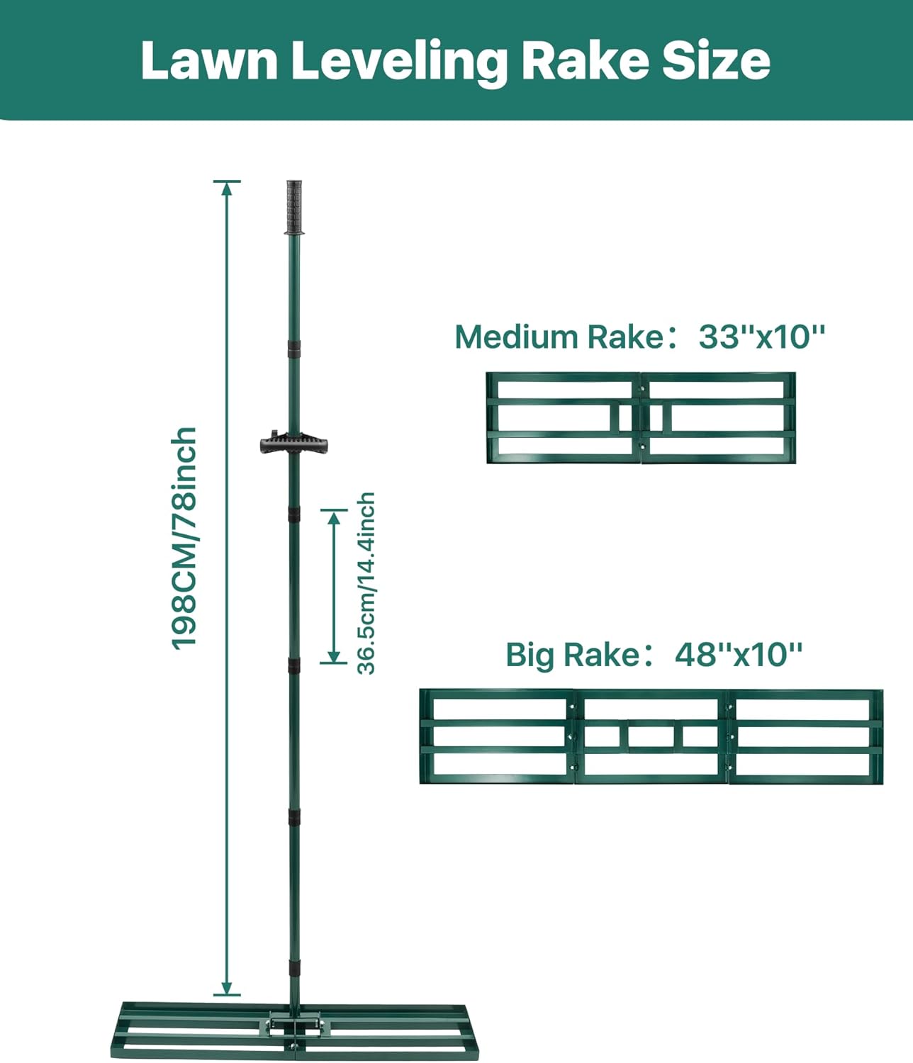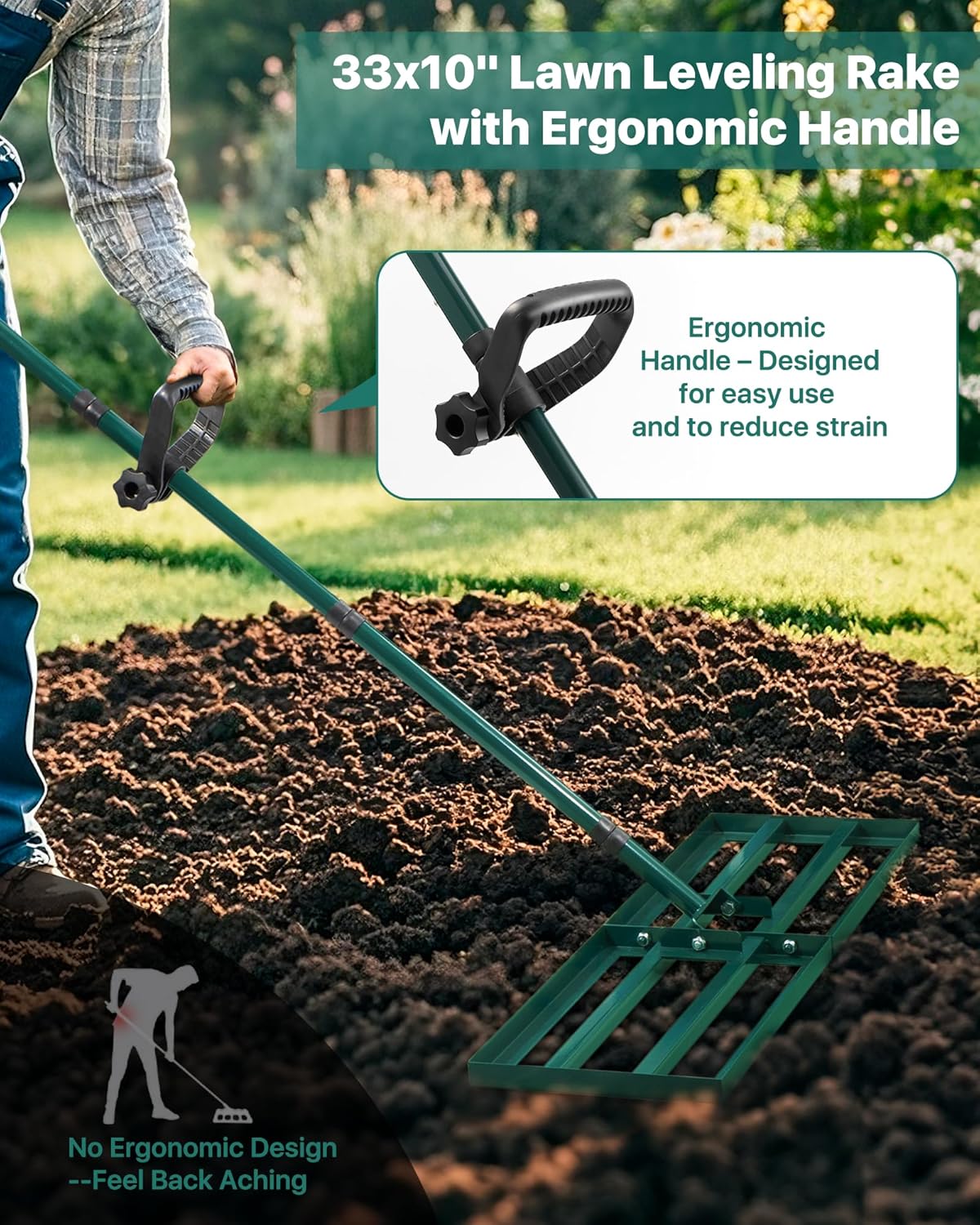 - Upgrade Structure & Multi-Function: 33x10'' lawn Leveling Rake is designed to tackle a variety of garden tasks, including distributing application materials, removing stones, breaking up small clods of sand or loam, mixing soil with fertilizers, and smoothing the soil for effortless planting. Mutil-function lawn rake makes planting and gardening much easier