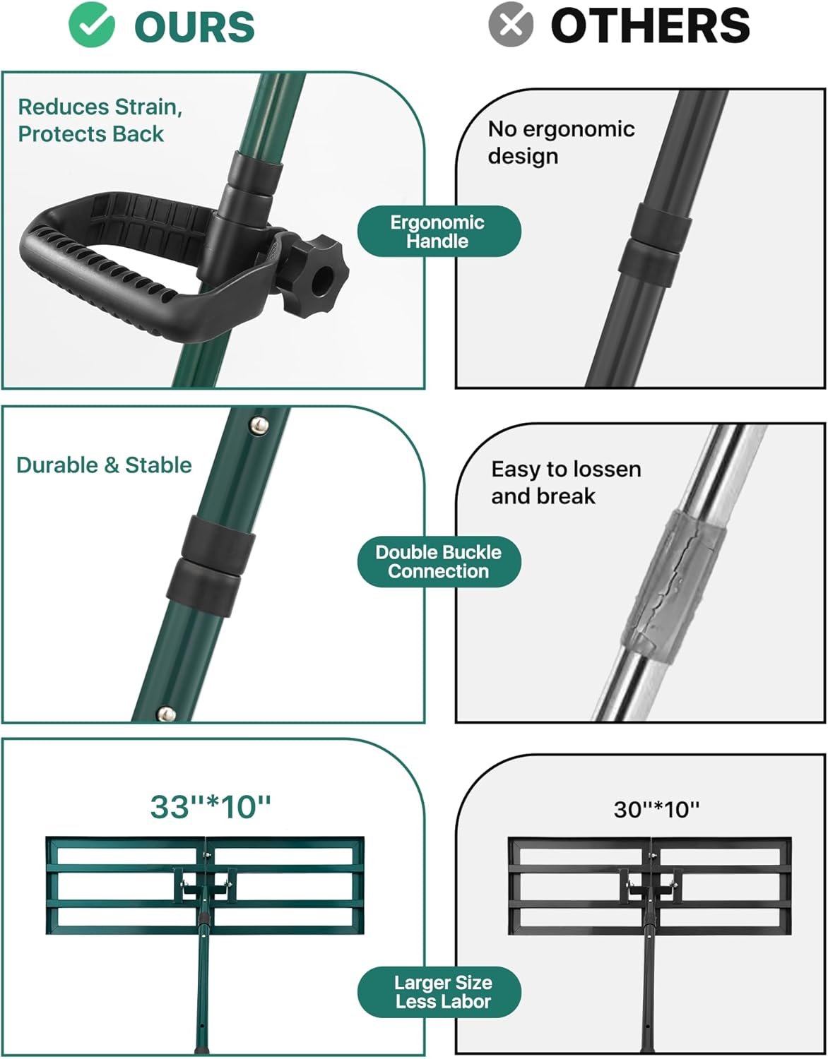 - Ergonomic Handle: Ergonomic handle of lawn leveler is designed for comfort and efficiency. Ergonomic handle reduces strain on your hands, wrists, and shoulders, preventing fatigue and improving control, even in wet or muddy conditions. The handle encourages a natural, upright posture, minimizing back pain and allowing for longer, more comfortable use. making lawn leveling faster and less physically demanding