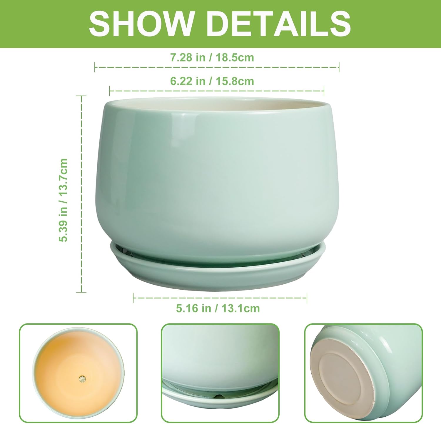 G EPGardening Ceramic Plant Pots - 7 Inch Planter for Indoor Outdoor Plants, Ceramic Planter with Drainage and Saucer, Round Modern Flower Pots, House Decor, Gift for Men Women, Green