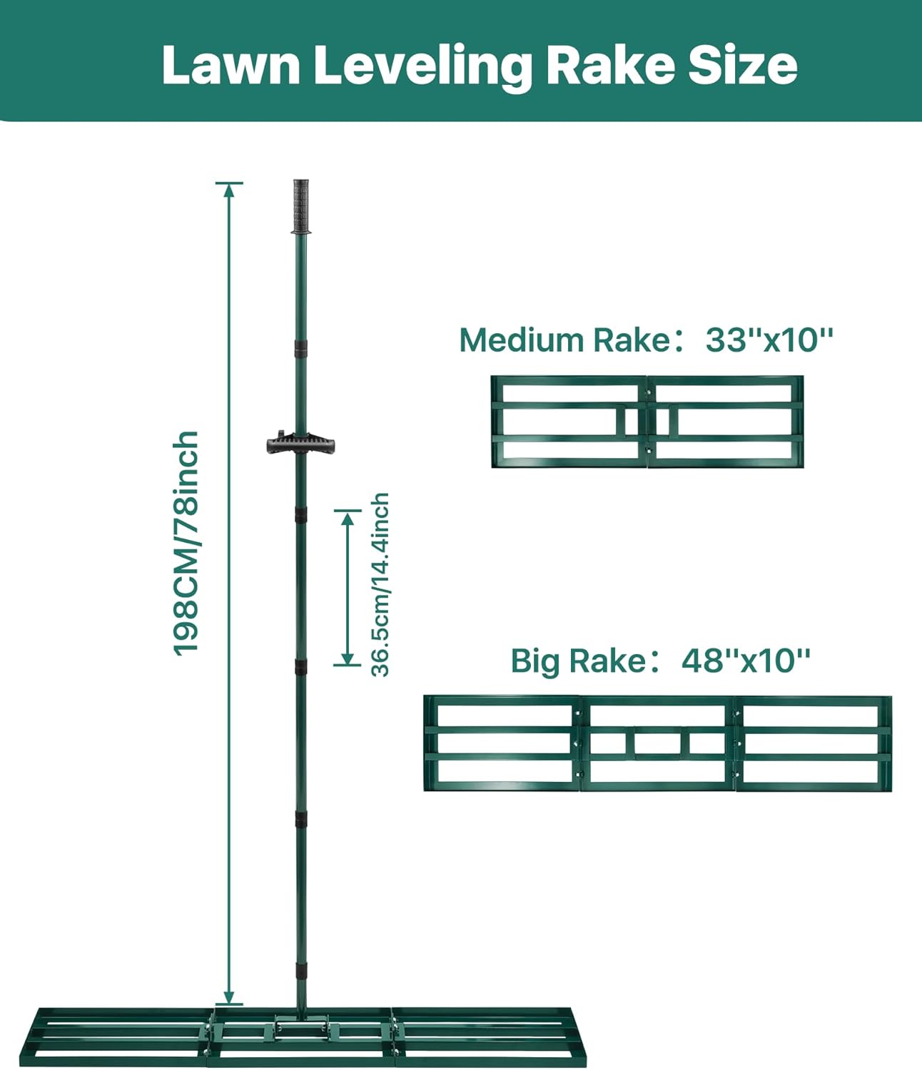 - Perfect for All Lawn Types: Available in 2 different ground plate sizes (33" x 10", 48" x 10"), Garden Rake is suitable for a variety of grass types, including Bermuda, Kentucky Bluegrass, Ryegrass, St. Augustine, and Fescue. JivaJot rakes for lawns come with 78'' adjustable pole handle and an adjustable angle (0° to 180°), making it adaptable to different lawn sizes and user preferences