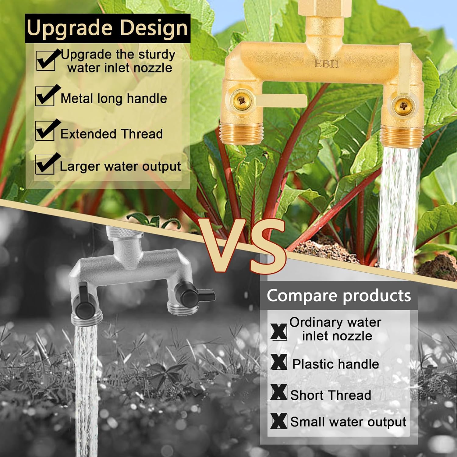 EBH Garden Hose Splitter, Full Flow Outdoor Faucet Splitter, 2-Way High Flow Brass Heavy Duty Hose Splitter with Long Metal Handle。