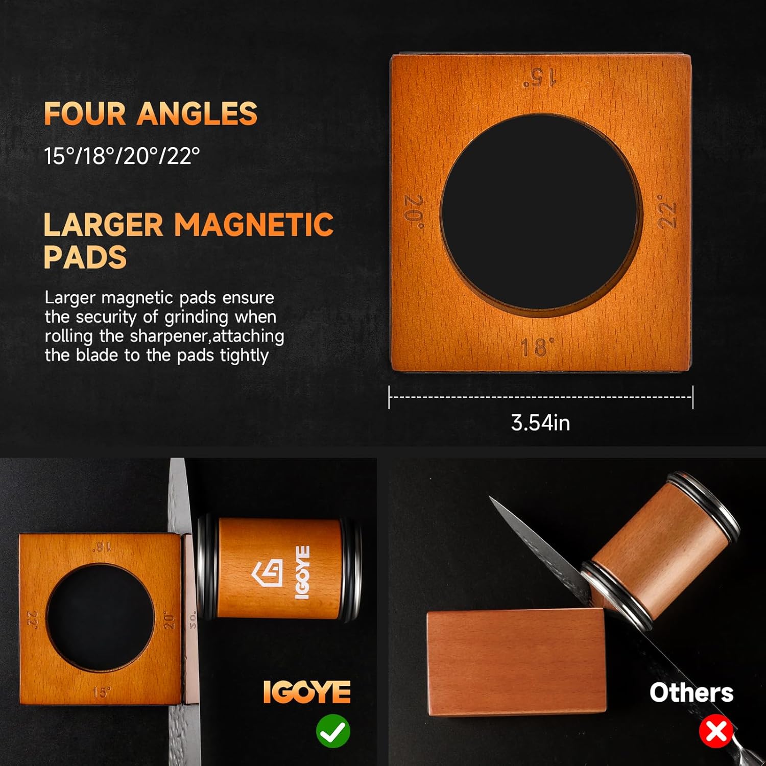 - 【MULTI-ANGLE MAGNETIC SUPPORT】Knife sharpener every angle magnetic support contains 3 N42 High quality super-strong magnets to keep your knife firmly attached to the base without moving, has 4 different sharpening angles (15°,18°, 20°, 22°degree) equipped with anti slip silicone, to serve your needs and demands perfectly.