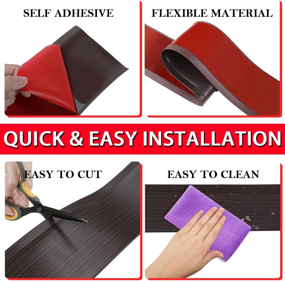 - Self-adhesive Design: this flexible peel and stick vinyl baseboard with a strong adhesive backing is very convenient to complete the installation. Note: If the temperature is below 68℉, please use a hair dryer to heat the adhesive before sticking it to the wall.