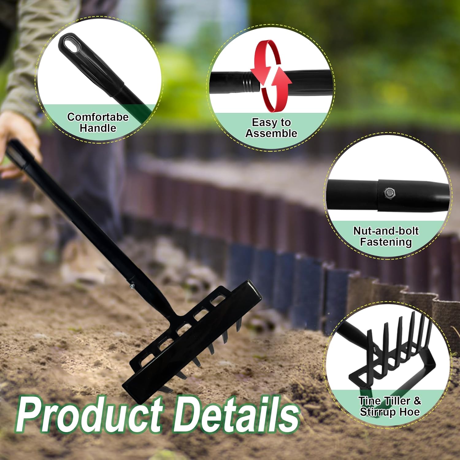- 【Easy to Assemble and Store, Portable】Action hoe and rake comes in 5 sections. The shaft material is a series of metal tubes that screw together. Each pole has a plastic coverings to protect the joints and a threaded end, making it simple to screw the parts together, just screw the thread into the plastic grip. Then, Securing the hoe/cultivator with nuts and bolts. It’s easy to assemble and take apart, does not take up much space in the shed, making storage and transportation easier.