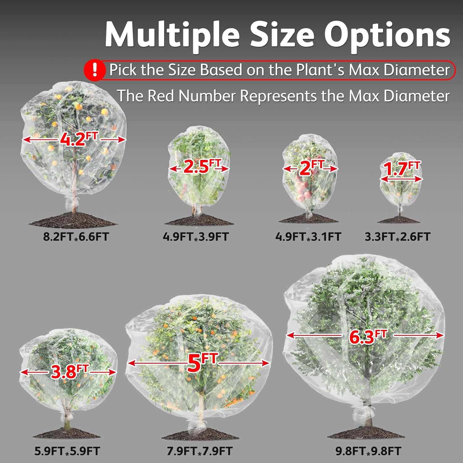- JOJOLEE Garden Net Kit: This kit includes 2 packs of 8.2 ft(H) x 6.5 ft(W) garden net with a spread diameter of 4.18 ft. Before buying, please take the time to check the diameter and height of your plant to make sure the insect netting is sufficient to cover it.