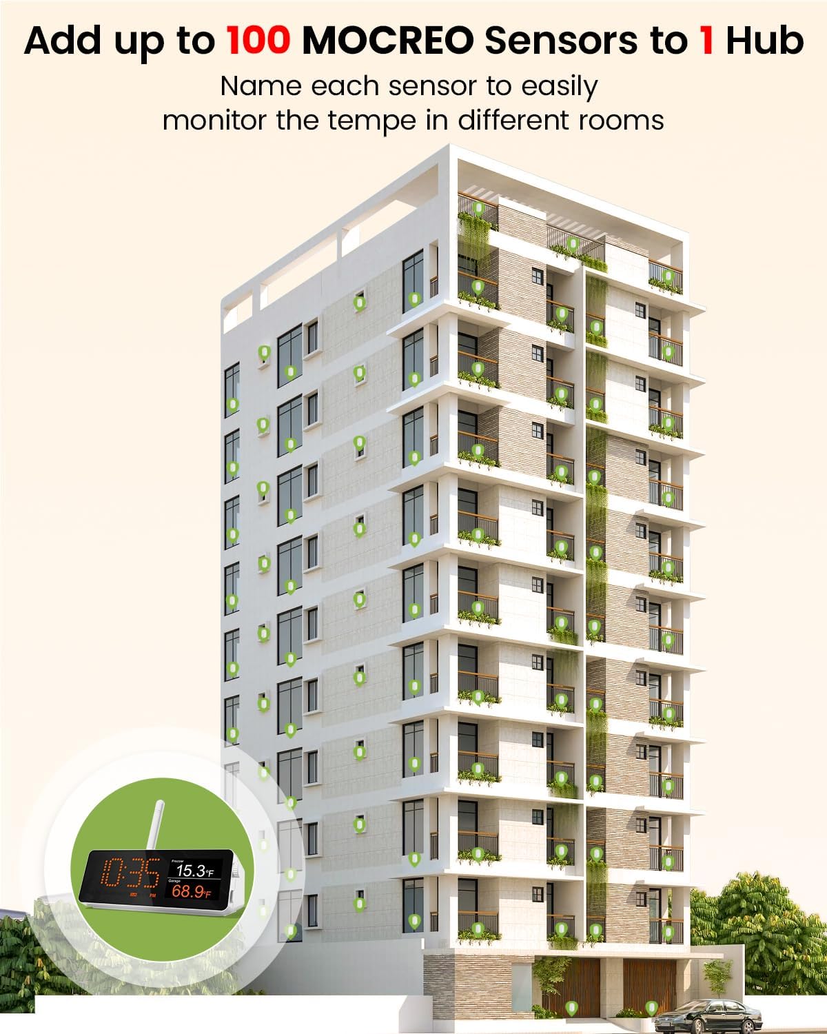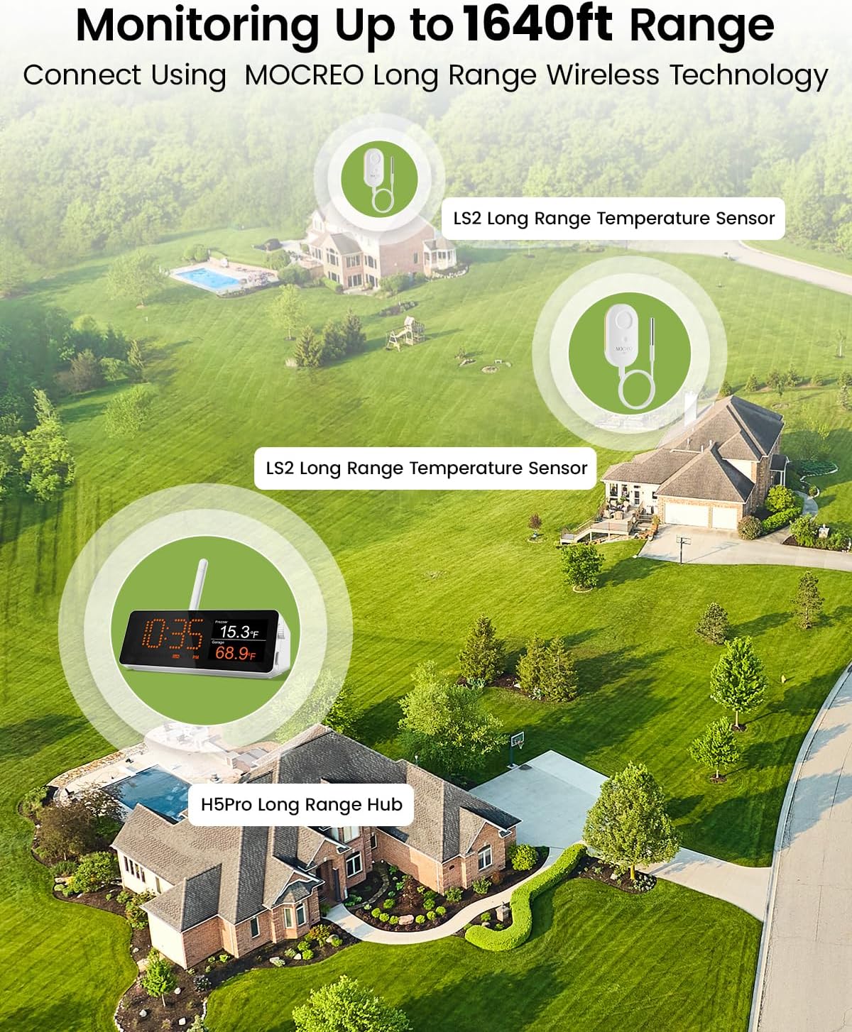 - 24/7 Remote Monitoring: The H5Pro Hub utilizes an extremely long-range wireless protocol to communicate with up to 100 sensors, at an open-air range of up to 1640ft (1/3 mile). The LCD display offers real-time monitoring, making it a comprehensive dashboard for historical data review, alarms, clock, weather, and calendar updates (Only supports 2.4 GHz WiFi)