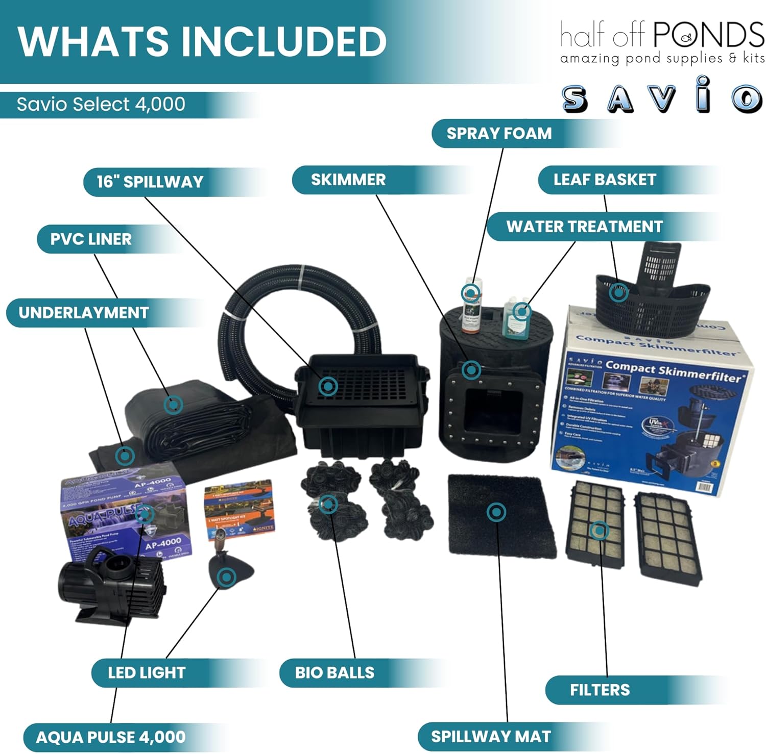 HALF OFF PONDS Savio Select 4,000 GPH Submersible Pump Pond Kit with 15' x 25' PVC Plastic Pond Liner for Water Garden & Koi Pond