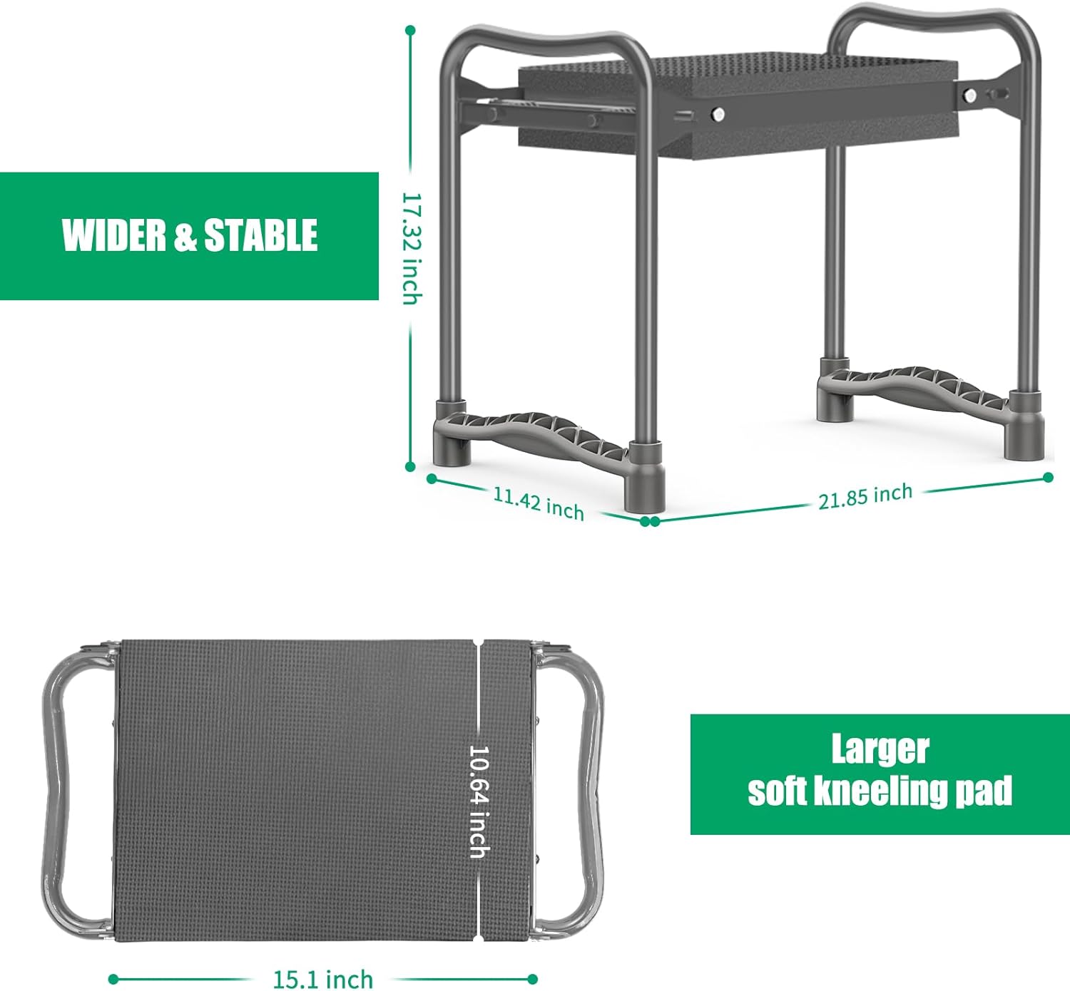 - 【10.64” WIDER LARGER SOFT KNEELING PAD】This TomCare garden kneeler and seat is built with larger soft kneeling pad than other’s: 10.64 inch in width, 15.1 inch in length. Larger softer EVA foam pad is more comfortable when sitting or kneeling. Besides, wider metal frame is more stable, no worries about tipping over.