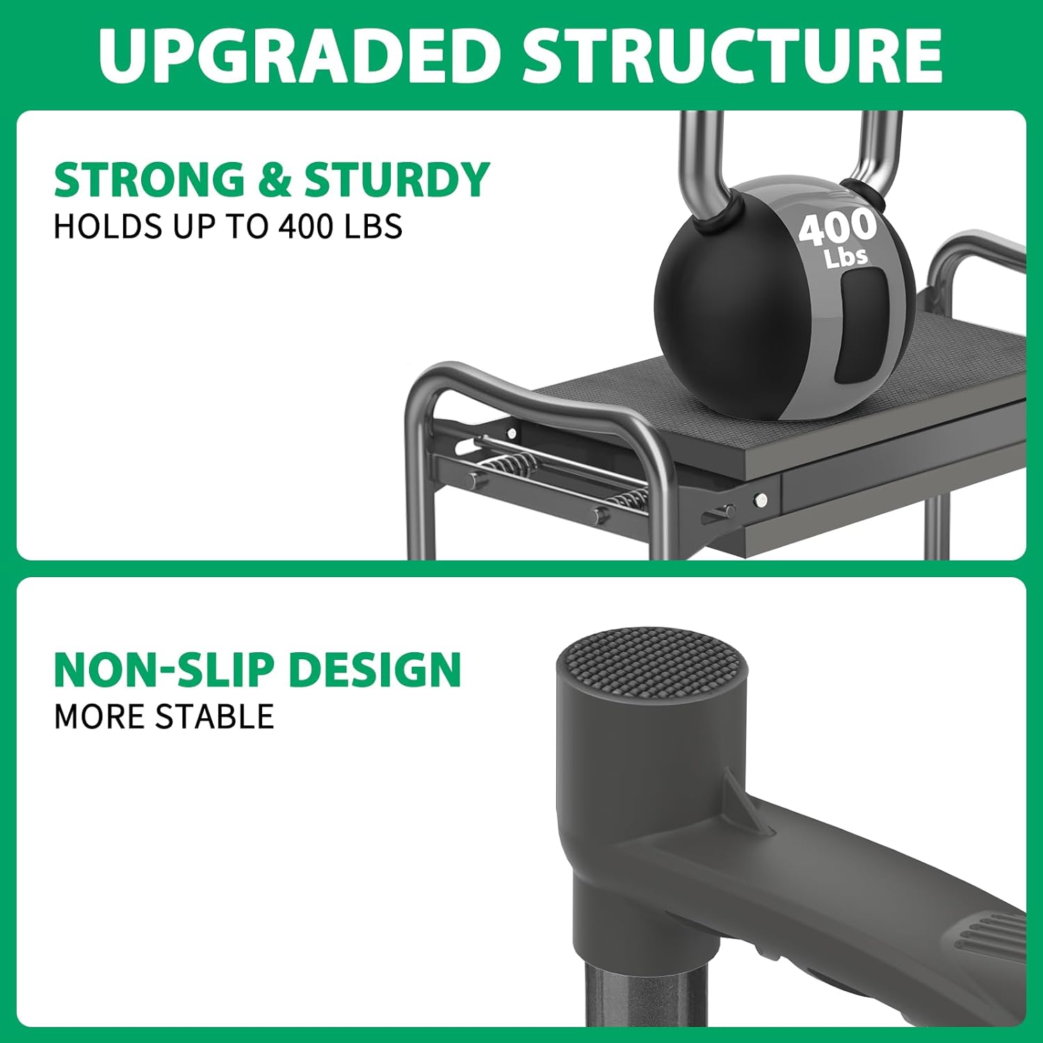 - 【HOLDS UP TO 400 LBS】Made of quality materials, this TomCare garden kneeler is very strong and durable. It can effortlessly support up to 400 pounds, ensuring stability and durability. It comes with 2 large tool pouches, you can put them on both sides of the garden stool, so that your gardening tools are always handy.