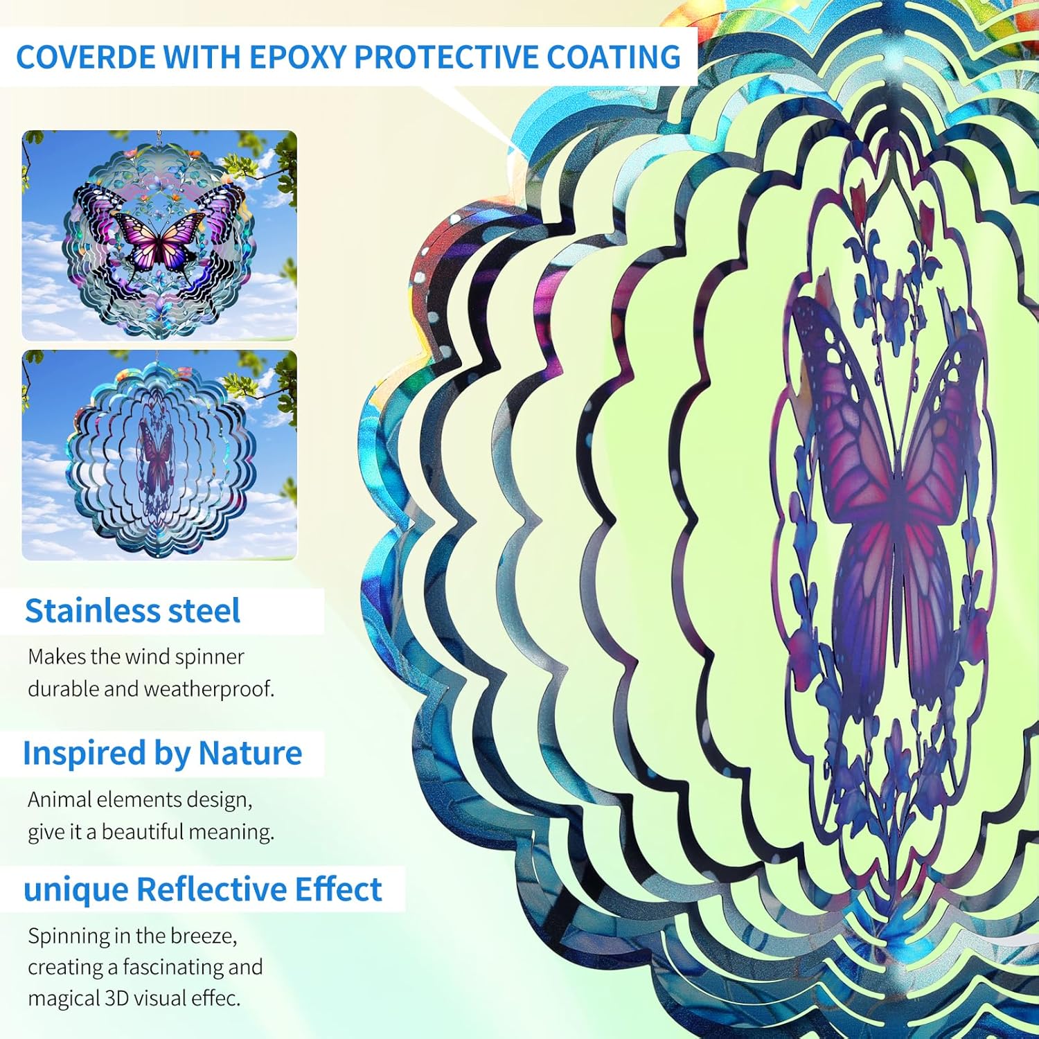 - Butterfly Wind Spinner Outdoor Garden Decor, butterfly metal wind spinner is made from Sturdy stainless steel material by laser-cutting technology to form vivid shape, makes it flexible and strong, is individually hand painted by epoxy protective coating with colorful sparkle powder inside to highly resist weather and rust. a frosted paint finish, giving off a sparkling when it spin. The unique design combined meaningful animal pattern and a 3D streamer effect.