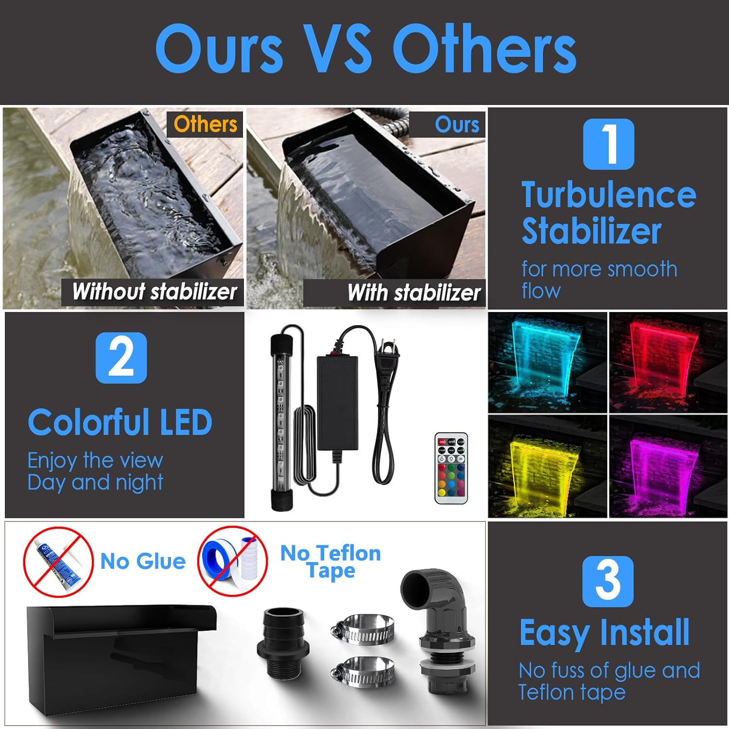 - REMOTE-CONTROLLED LED LIGHTS - This pond waterfall box features remote-controlled colorful LED lights, adding a stunning glow to your waterfall not only in the daytime but also at night! Transform your outdoor space into a magical retreat with ease. REMINDER - Peel off the battery insulation film of the controller, press ON until LED flashes to pair the controller and the light.