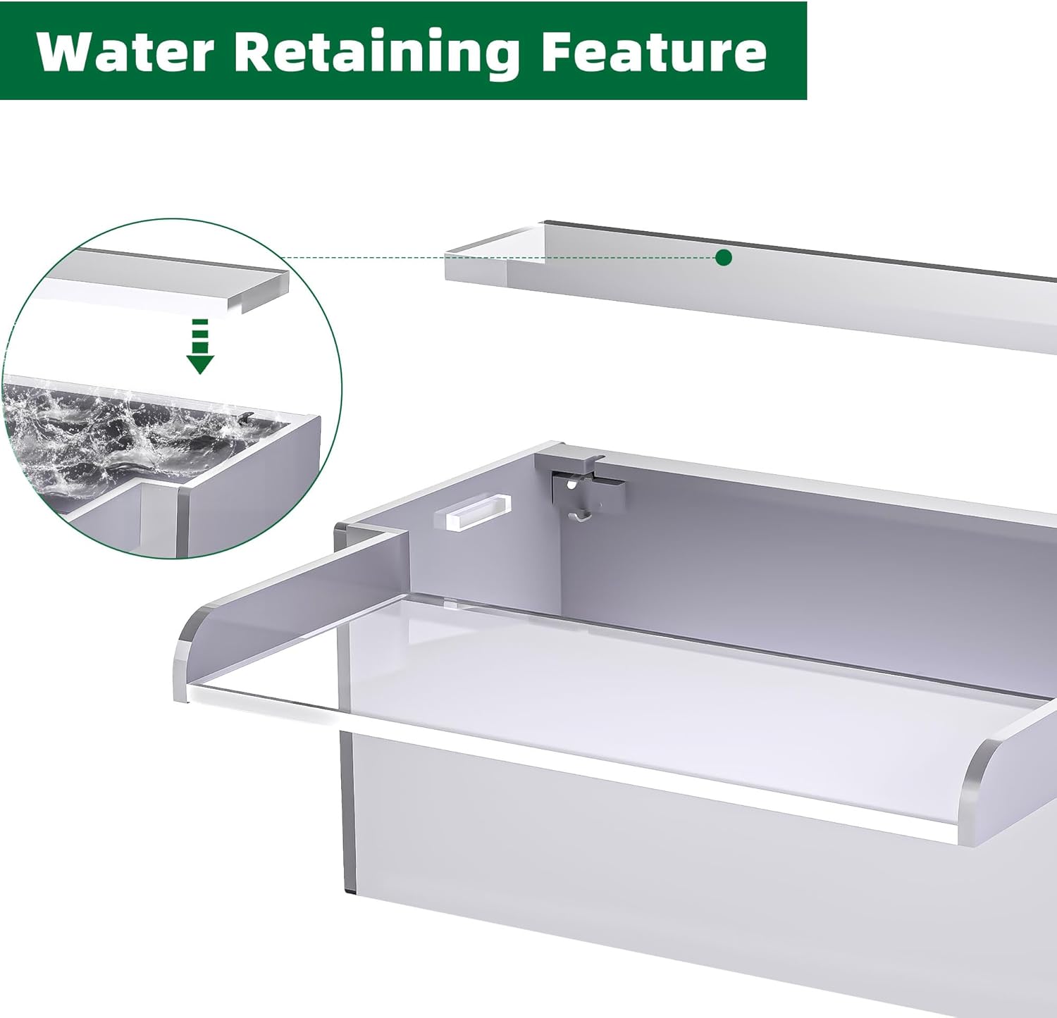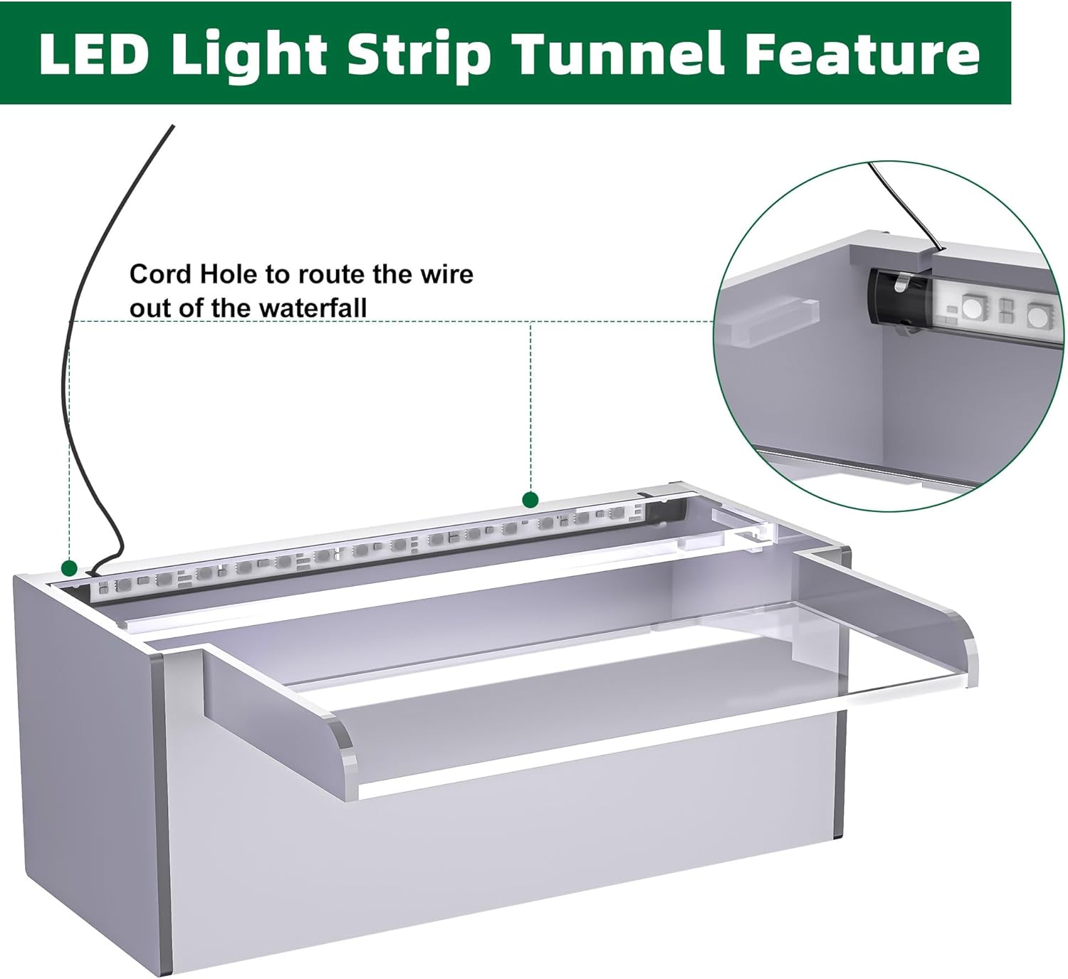 - 【Enhanced Upgrade Design】- This upgraded design includes a specialized channel for the LED light strip and two cable outlets to neatly route power cables, keeping them hidden from view. Ideal for those who want to add an LED light strip separately. To further enhance functionality and efficiency, a splash guard has been integrated at the open top of the waterfall. Additionally, a precisely positioned baffle at the water inlet ensures regulated and optimized water flow, creating an appealing visual effect while reducing unwanted splashing.