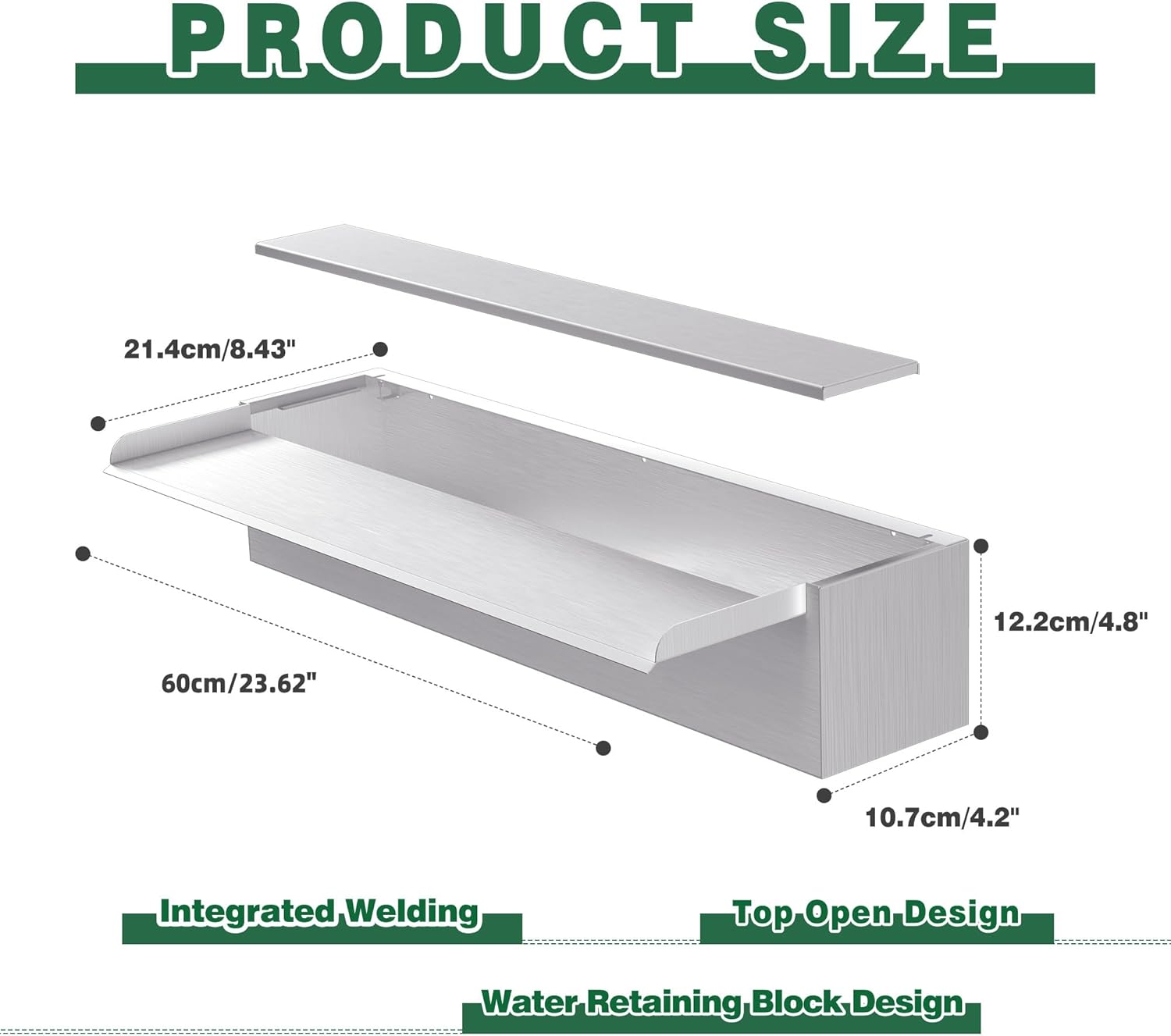 - 【Anti-Rust Spillway Waterfall】- Our welded in one body one-piece 304 stainless steel construction of this spillway waterfall provides long-lasting strength, rust resistance, and leakproof performance. The open lip design creates an elegant freefalling waterfall that adds decorative flair to ponds and pools. The soothing sound of the cascading water promotes relaxation and tranquility.