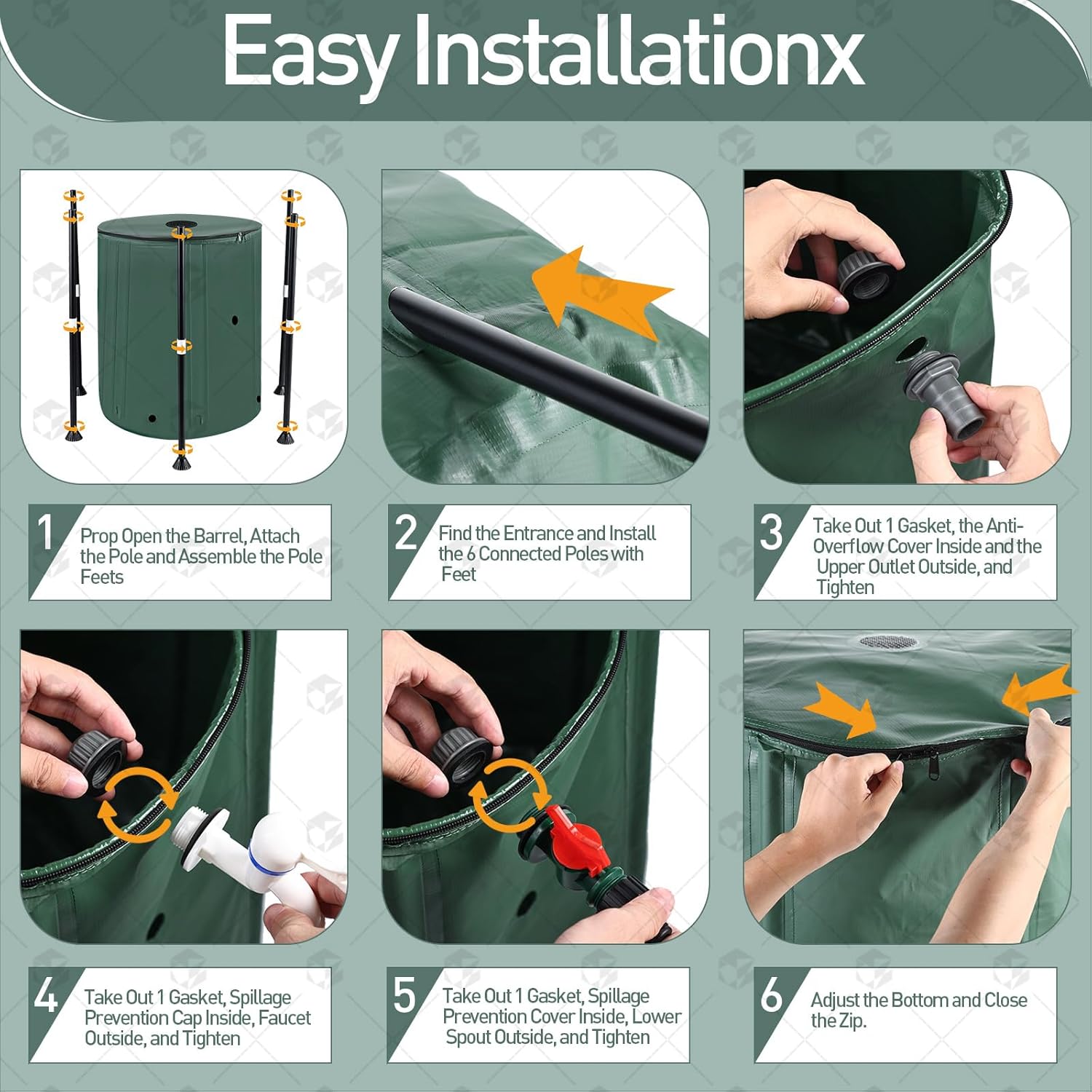 - Easy To Install and Storage: Please Follow the instructions or video for installation. When opening the rainwater collection barrel, you'll need to install the 12 poles and intermediate connection parts, then the 3 spouts (1 Spigot and 2 Overflow) and finally zip up the top. The Foldable design is easy to install, carry and transport; when not in use, it can be placed in the garage or utility room. PLEASE NOTE: Please place it on a flat surface when using it, as this will help to improve the stability better.