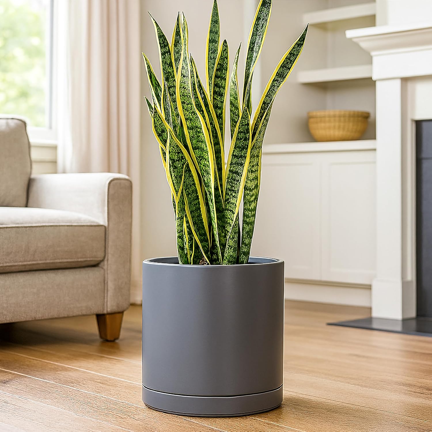 - Simple, elegant, and modern cylindrical straight round planter pot with saucer and drainage hole.